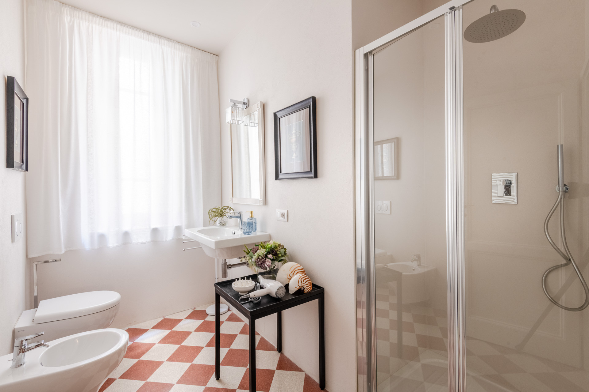 The apartment features three double bedrooms, each thoughtfully decorated with a touch of classic Italian elegance. One of the bedrooms boasts an exquisite frescoed ceiling, an authentic reminder of the home’s noble past.