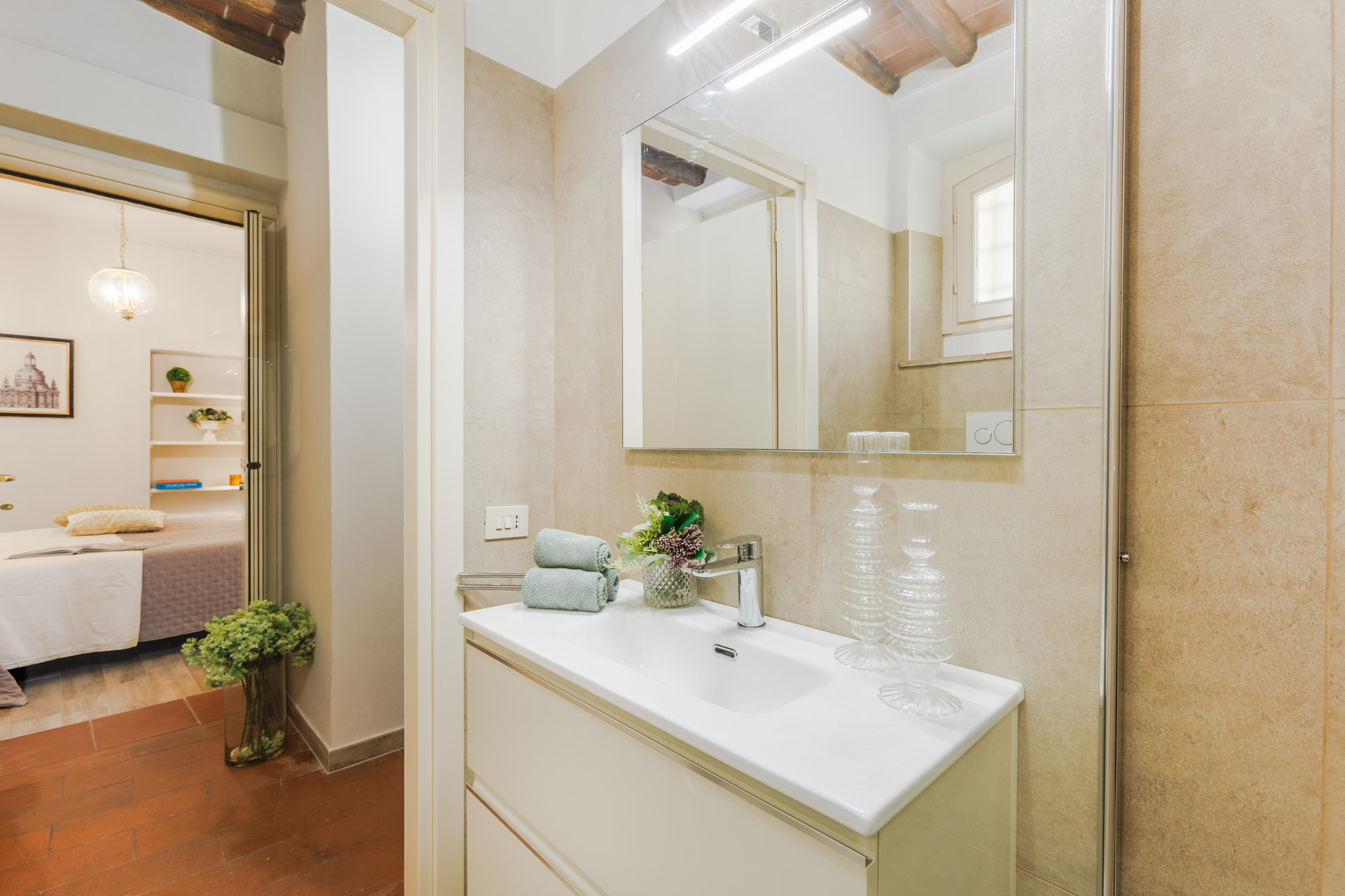 Its location is unbeatable: just steps from Piazza Antelminelli—home to the elegant café Undici Undici and its stunning fountain—and only a few minutes’ walk from the train station for effortless day-trips to Florence, Pisa, or the Tuscan coast. You can also conveniently reach the apartment by car, with parking just around the corner in Corso Garibaldi. The Renaissance walls are nearby for a leisurely stroll or bike ride, while the Duomo stands just behind, a constant reminder of the city’s timeless beauty.