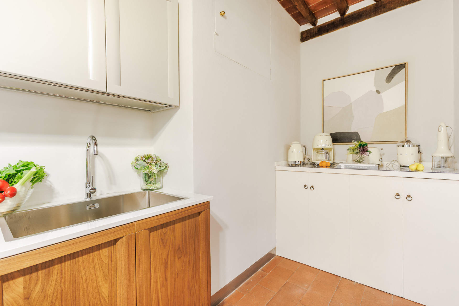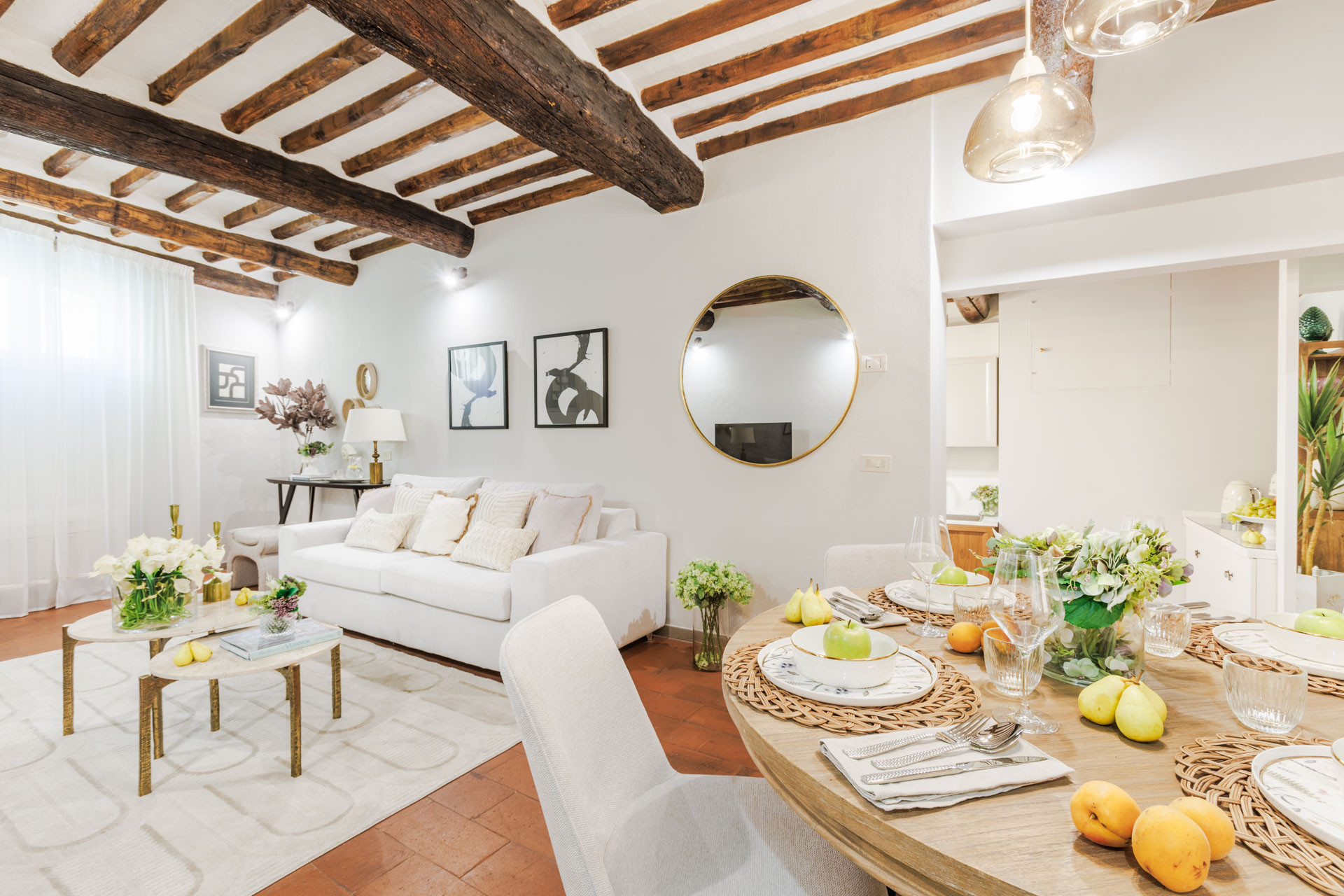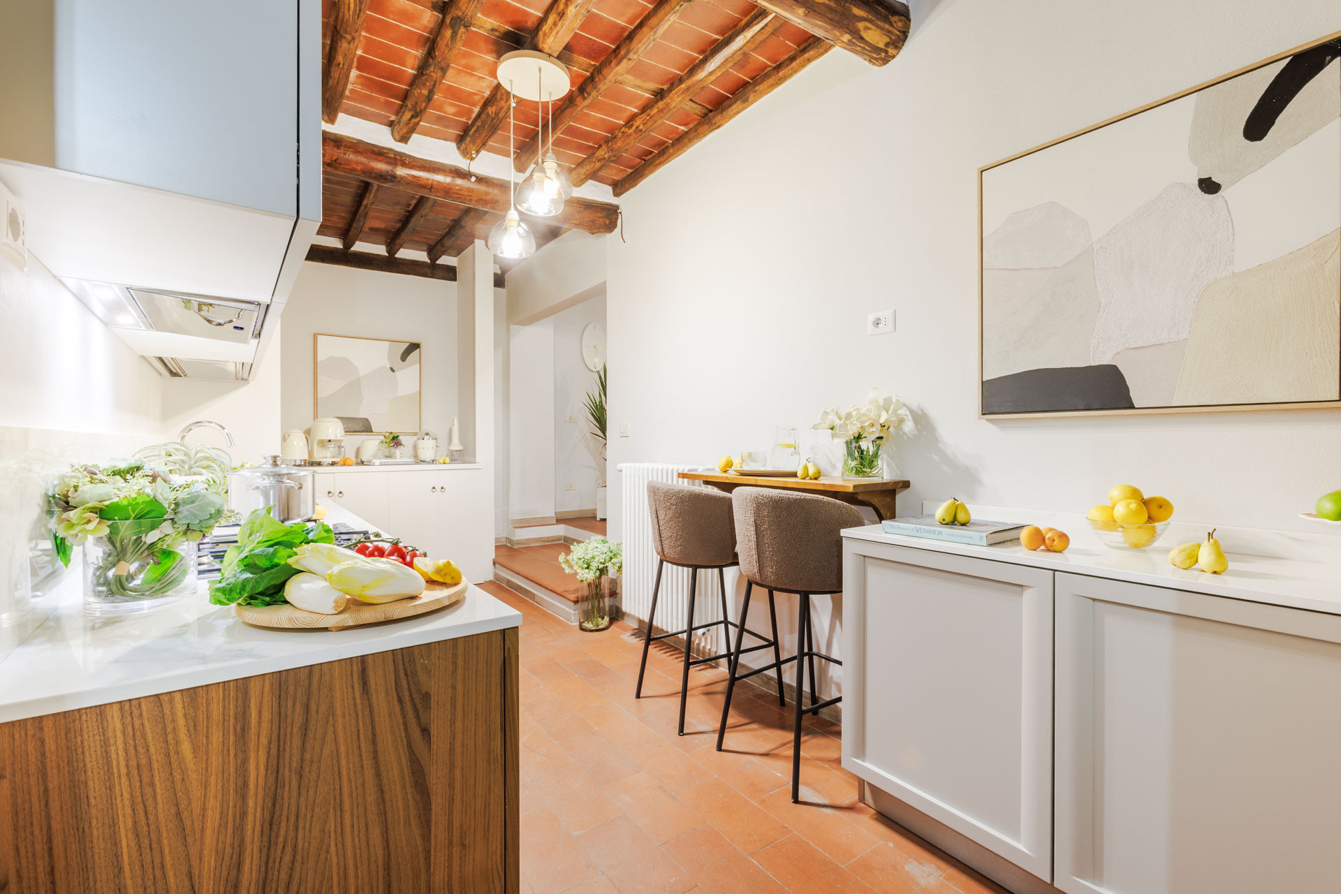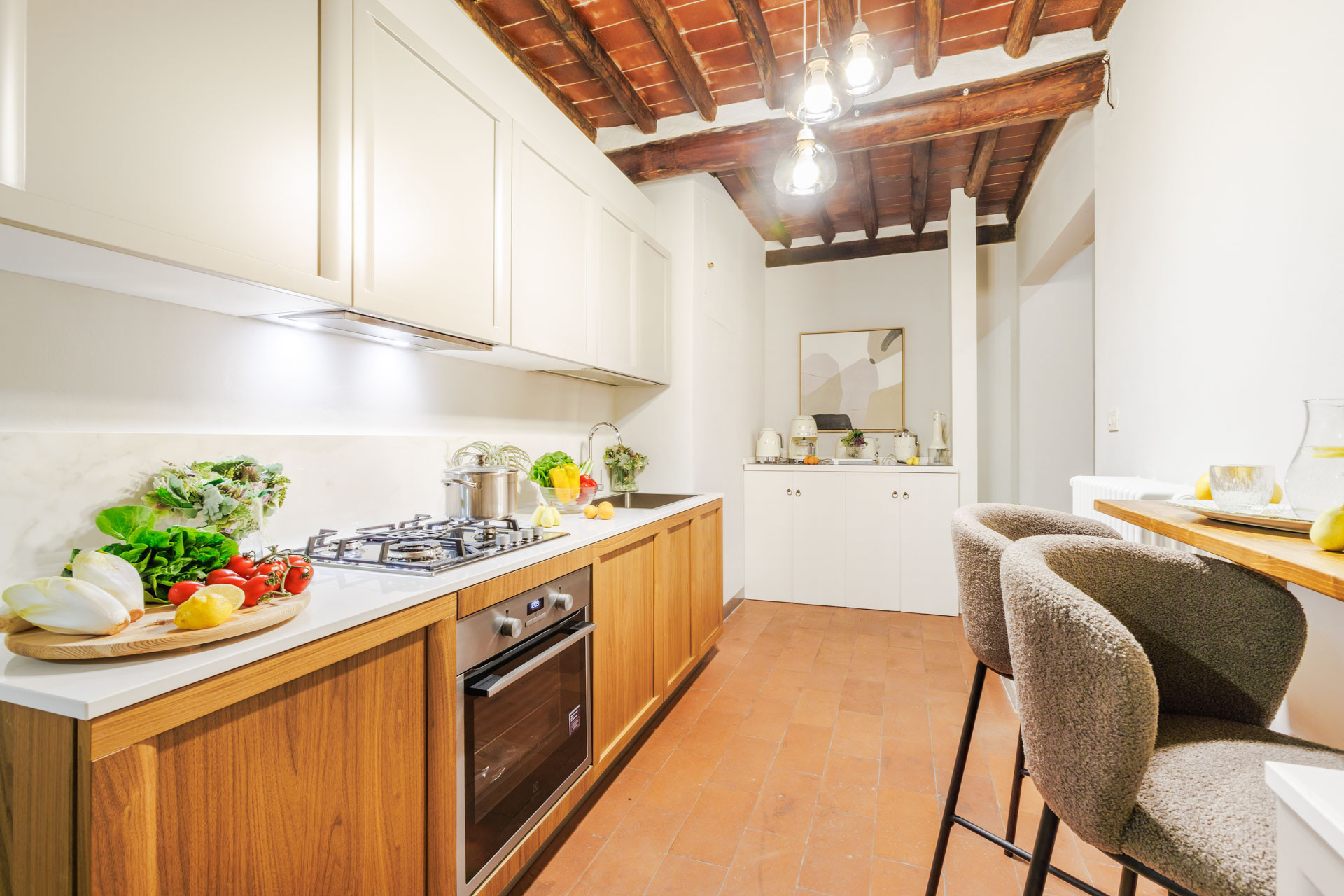 The interiors blend warm Tuscan character with contemporary comfort: exposed wooden beams, terracotta floors, and carefully chosen details create a welcoming atmosphere. The spacious living and dining area invites you to relax after a day of exploration, while the fully equipped kitchen allows you to enjoy local produce with ease. The bedroom is a calm retreat, styled with soft tones and plush textiles, ensuring restful nights.