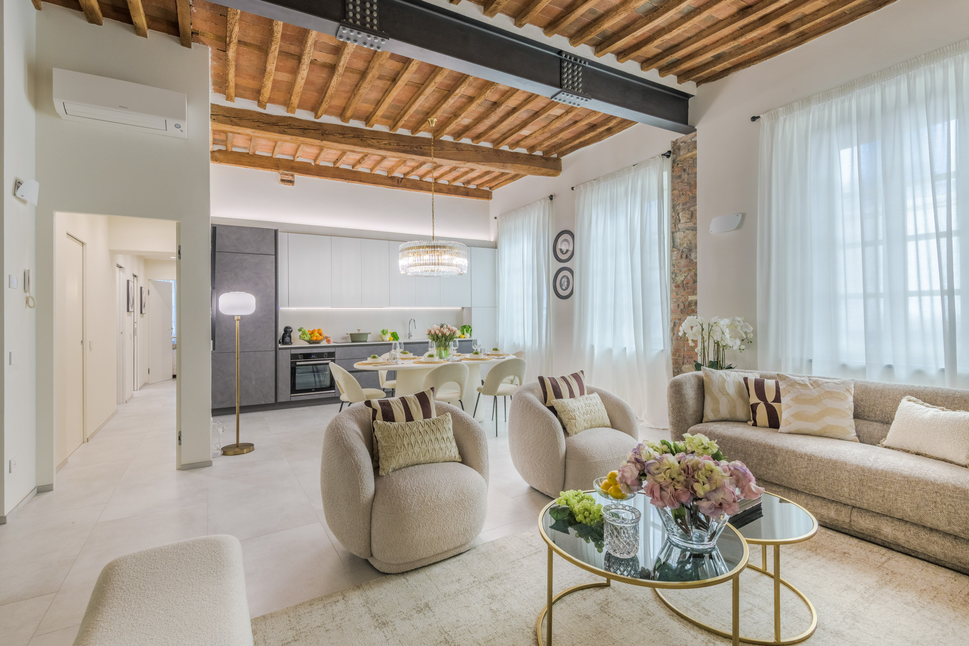 The whirling detail of the Clock Tower along the elegant Via Fillungo seems close enough to touch from the windows of the CASA UGOLINO apartment located in the shadow of the Church of San Michele. While the apartment is simpler than the ornate Romanesque marbles of the Cathedral, the house is elegant in itself, with parquet floors, tall windows, Carrara marble showers, and cutting-edge interiors and appliances.Open the windows and let the vibrant atmosphere rise from the streets and the square, or turn on the dock station and listen to your favorite music while sipping a local Lucchese wine with a view of the surrounding monuments. Although surrounded by relics of centuries of Italian history, the apartment has distinctly 21st-century luxury touches such as smart TV, Wi-Fi, washer + dryer, and air conditioning.From an open-plan living room and dining room, a large 14th-century window frames the view of Via Fillungo, once the silk trade gateway throughout Europe in the Middle Ages and now the city's most iconic landmark with its historic shops.This vacation home is located on the first floor and has 2 bedrooms with 2 bathrooms: 1 private bathroom and 1 that shares access to a bathroom in the corridor.A stay in this apartment puts you in the heart of Lucca, with the Guinigi Tower, the Amphitheater, Piazza Grande (also called Piazza Napoleone), the Cathedral, Puccini concerts at the Church of San Giovanni, the Walls, secure parking, the train station and bus station just 5 minutes walk or less from the front door. Spend the evening in the square and listen to orchestras improvising classical music pieces or relive your honeymoon on a horse-drawn carriage. If you have brought the whole family on vacation, you will appreciate the shops, delicatessens and grocery stores, bars and pastry shops within reach.DISPOSITION:The apartment is located on the 1st floor without an elevator.Entrance; living room/dining room - fully equipped living room and kitchen; wardrobe; Double room; bathroom (shower); master bedroom with private bathroom (shower). Wi-Fi Speed: 135 Mbps