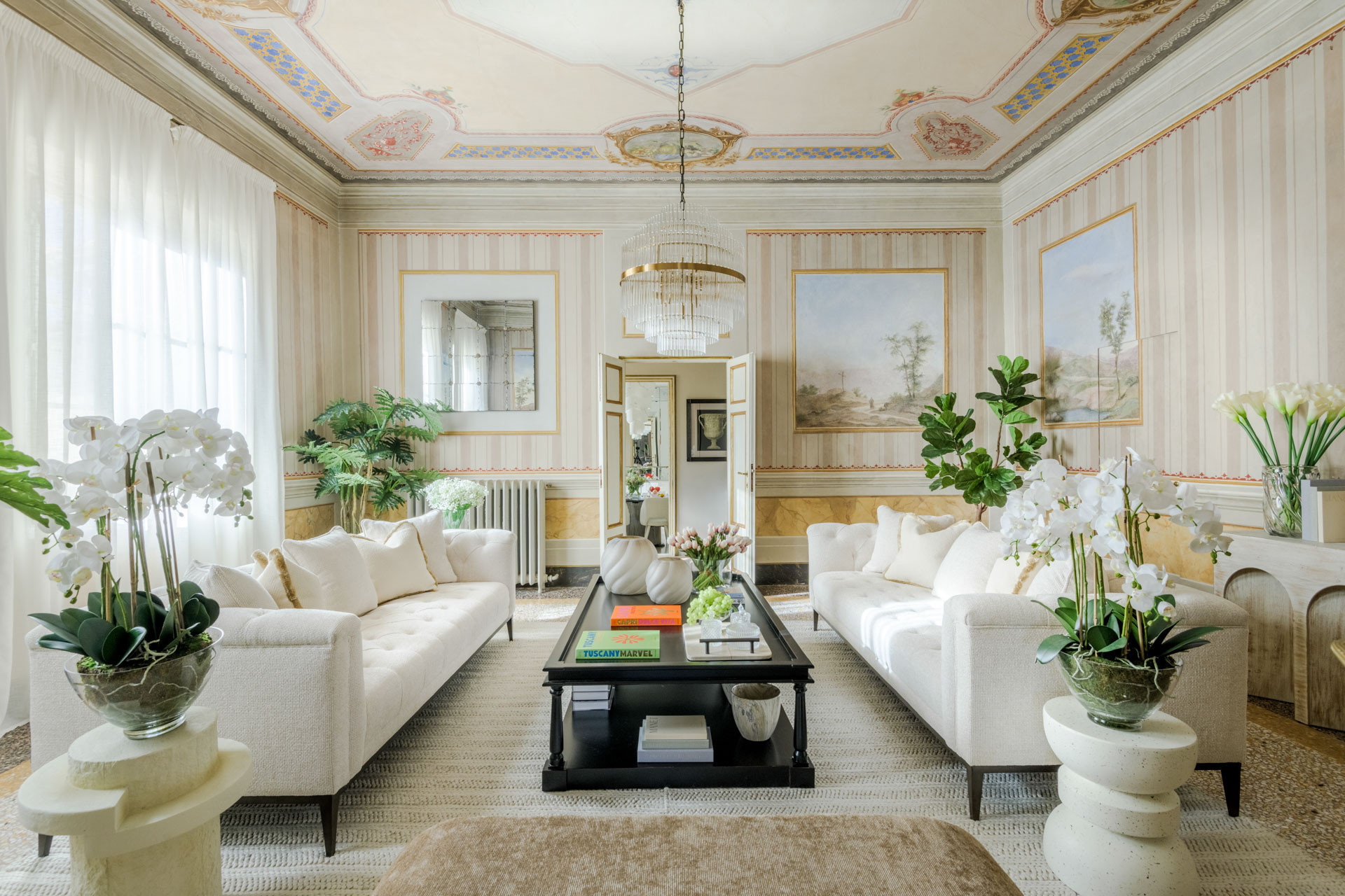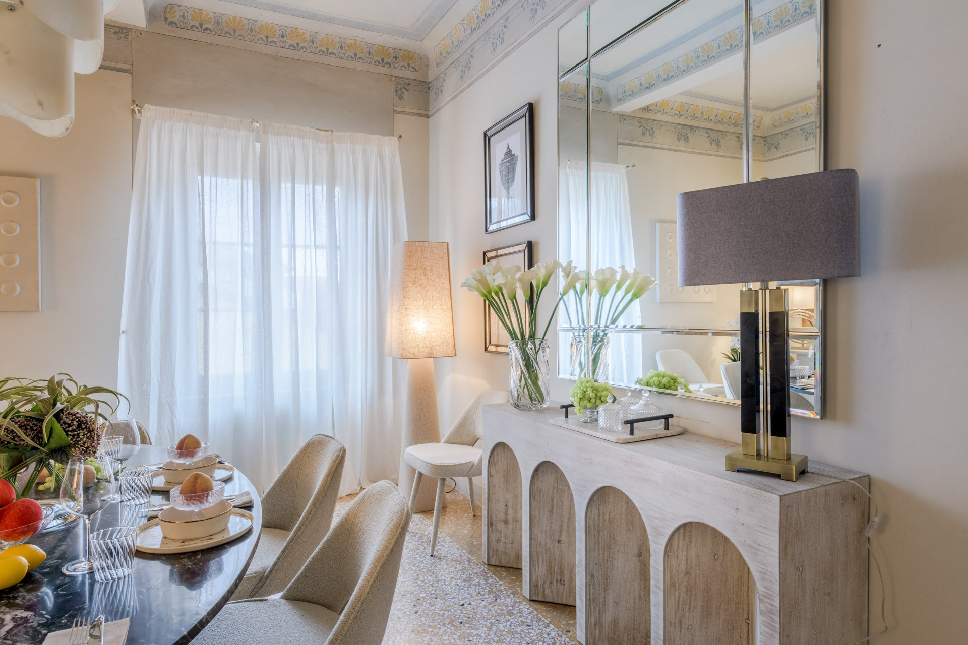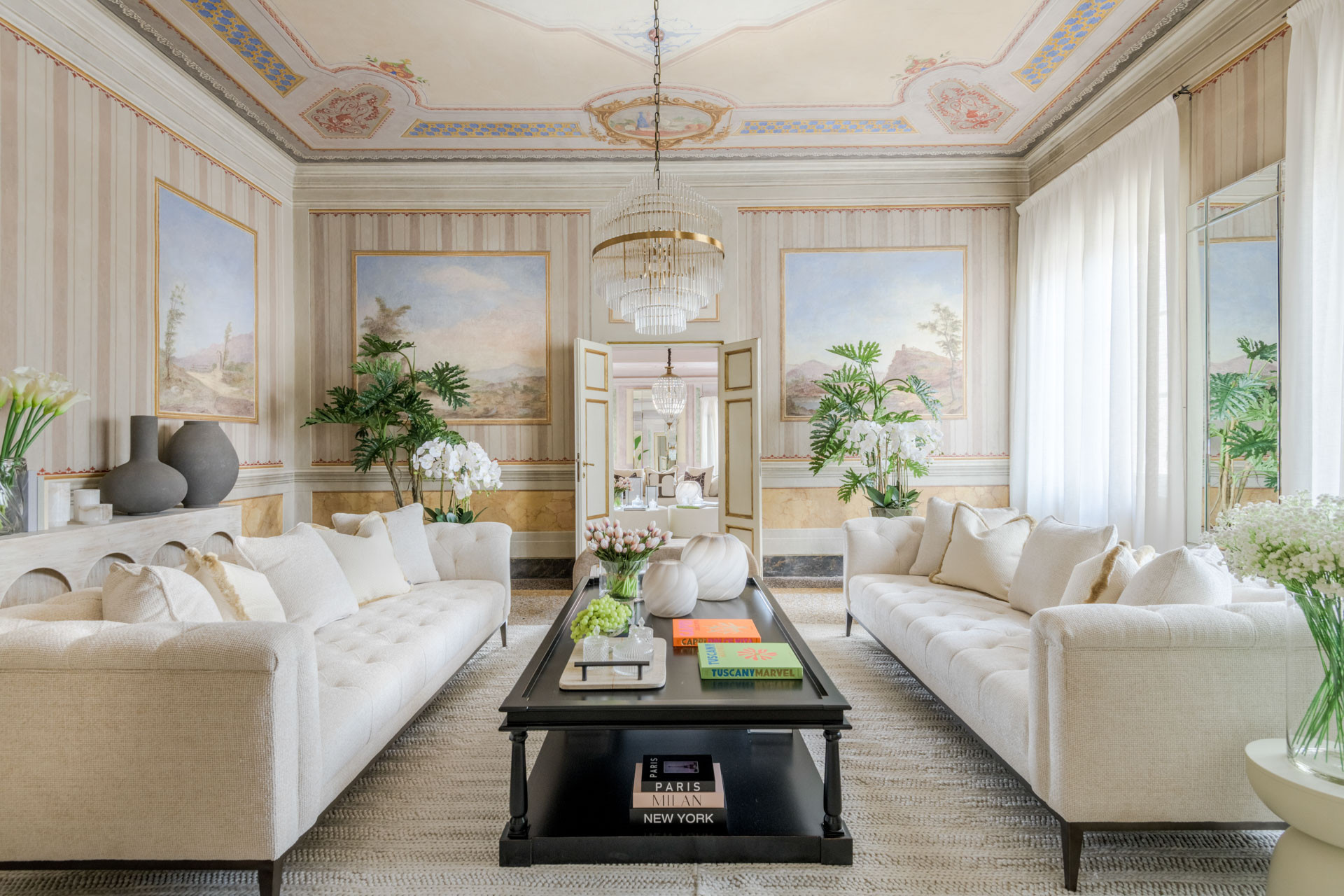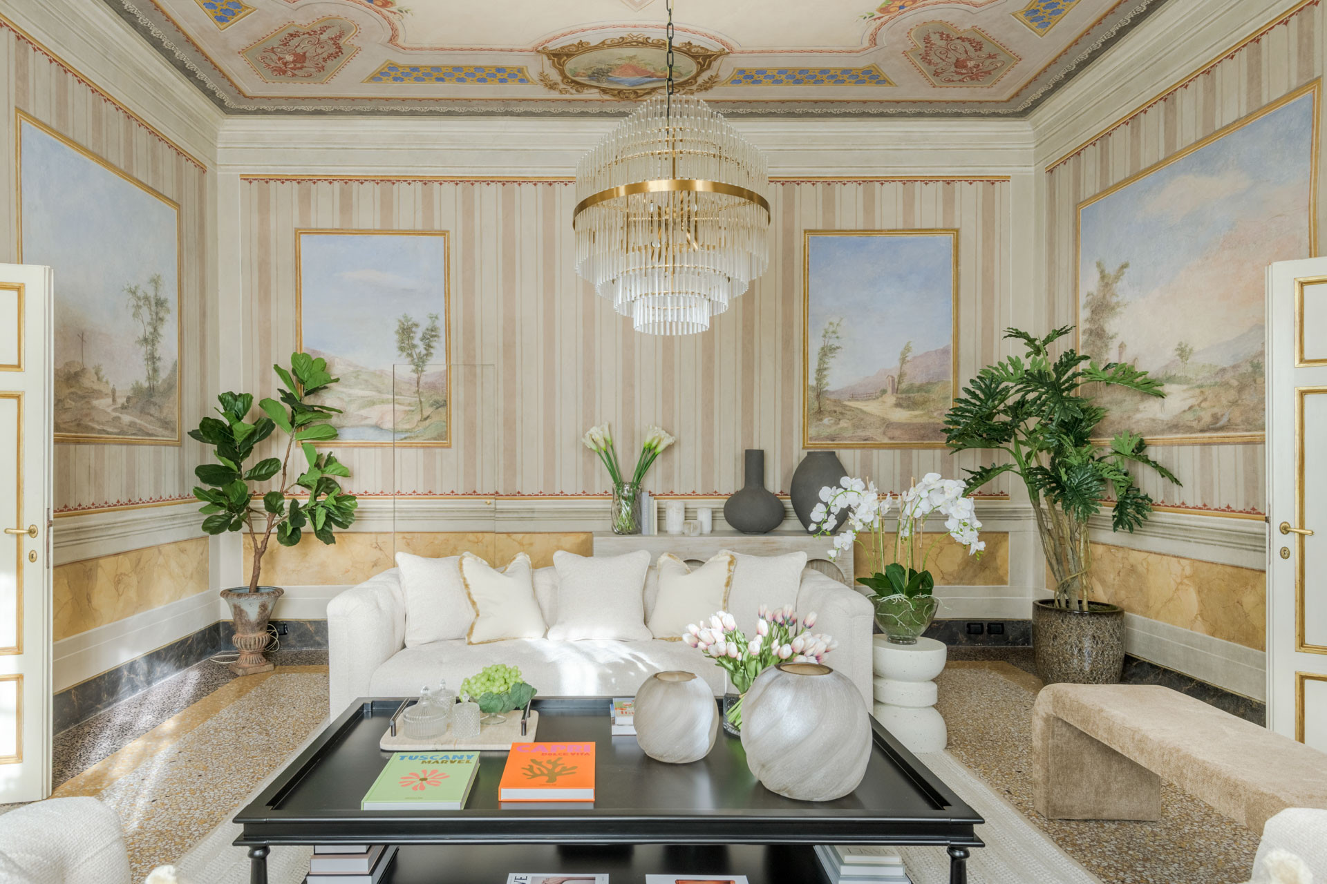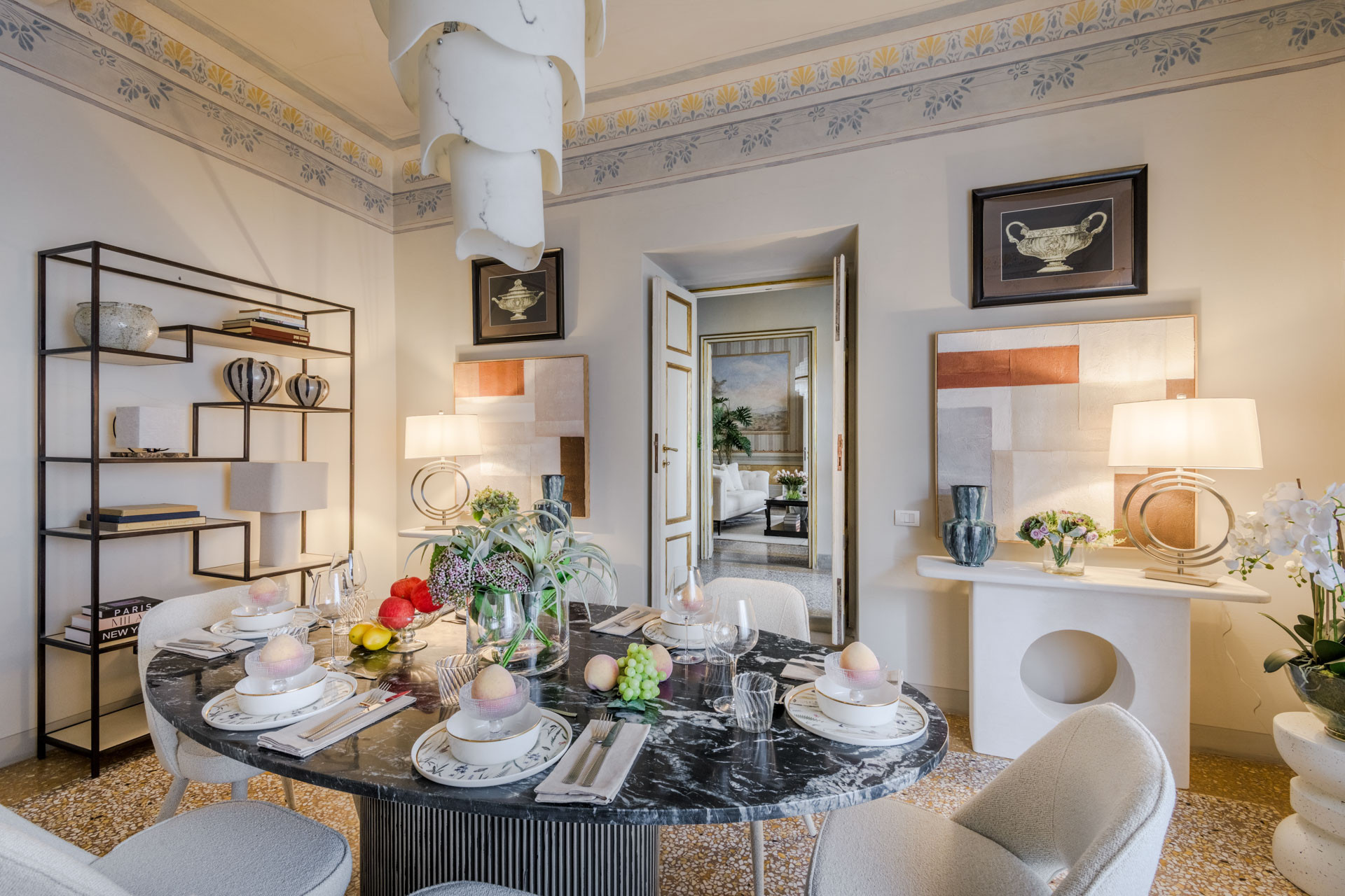 The spacious rooms of this historic palace still preserve their original early-19th-century decorative paintings, lending an authentic sense of grandeur and history. These artistic details have been carefully enhanced by the renovation, which introduces modern comfort, advanced systems, and discreet luxury—allowing the past and present to converse effortlessly.