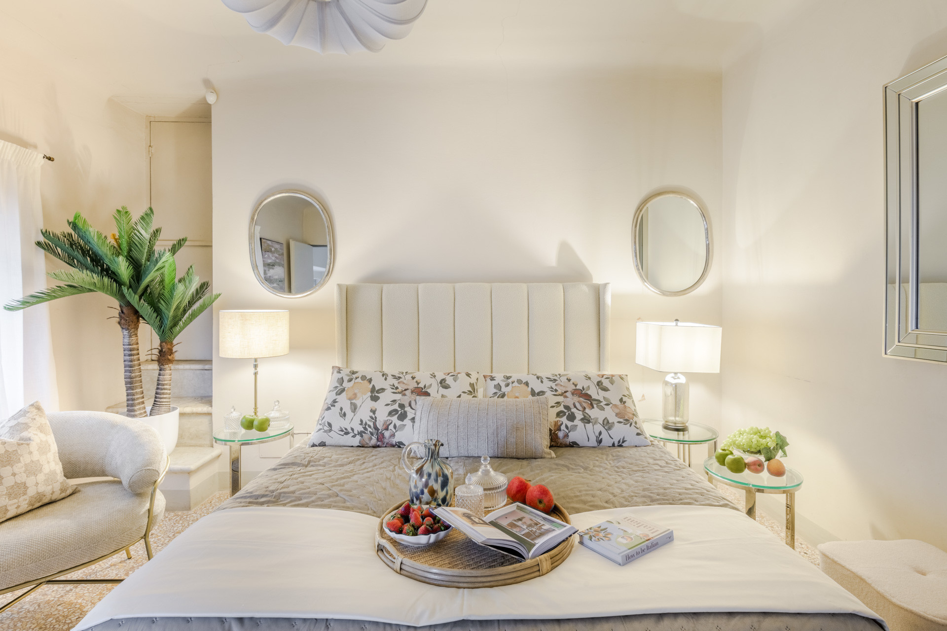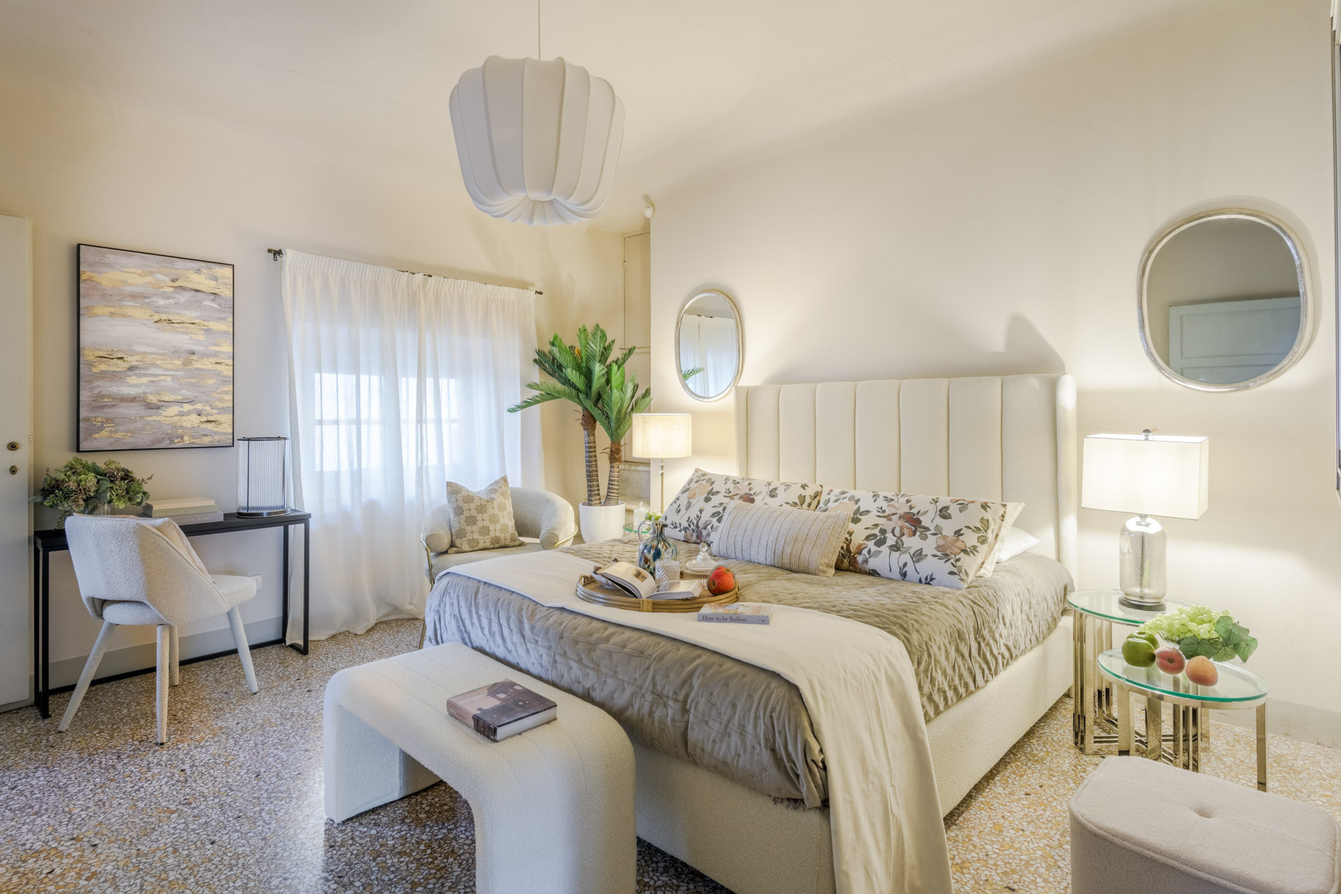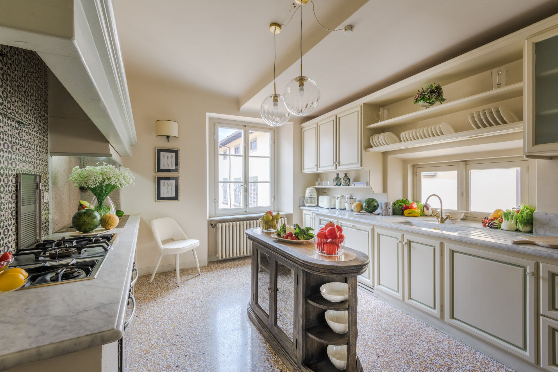 Murano glass chandeliers hanging from wood-beamed ceilings and richly patterned area rugs on the floors give this vacation rental a sense of traditional grandeur. But there’s modern flair in the living and dining rooms, too, thanks to a sophisticated velvety patterns. And the fully equipped kitchen is all contemporary, featuring a wide selection of appliances and cooking utensils that will enhance the cooking experience like a pro.