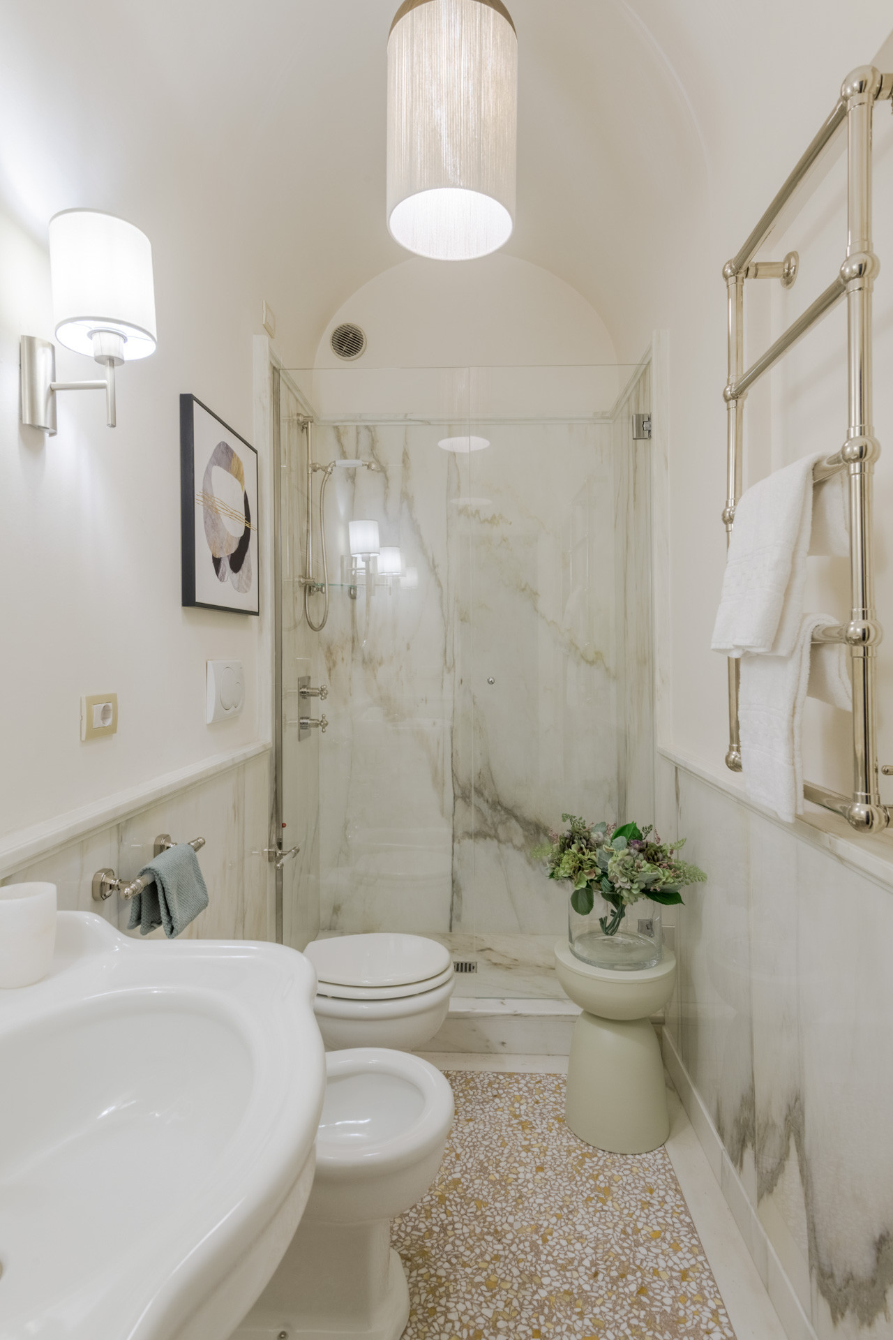 Recently renovated in late 2025, the penthouse seamlessly blends noble heritage with contemporary elegance. The apartment features four sumptuous suites, each with its own beautifully appointed classic-design bathroom, where Italian craftsmanship meets modern functionality. State-of-the-art interiors, refined materials, and bespoke details coexist harmoniously within a period architecture of rare character.