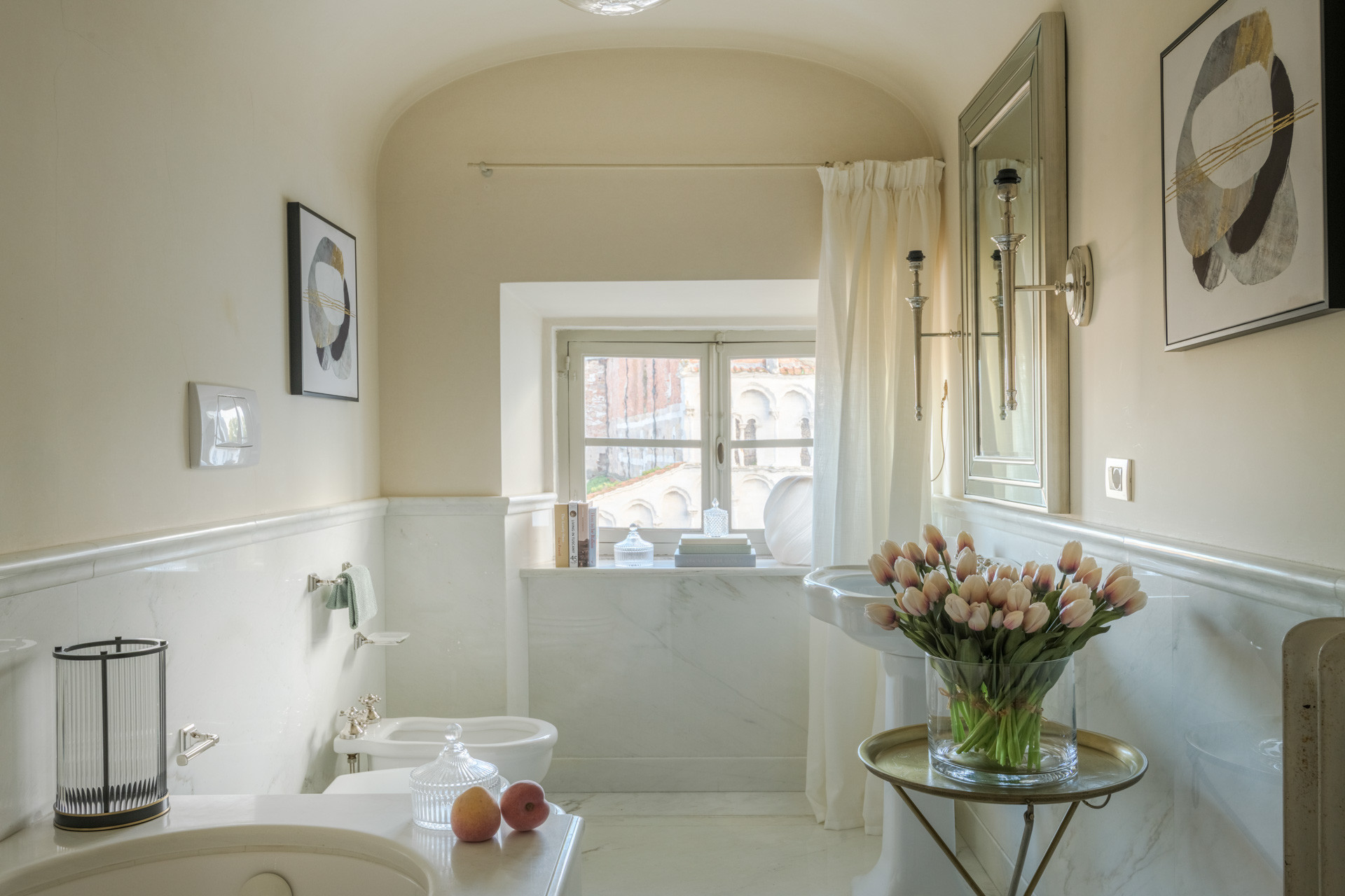 Completing this extraordinary residence is a panoramic terrace suspended above the city, an intimate and privileged space where Lucca reveals its most poetic side. As the sun sets, warm light washes over the marble façades and tiled rooftops, the bells echo softly across the piazza, and the city slows to a timeless rhythm—an unforgettable setting for aperitivi, quiet reflection, and evenings framed by beauty.