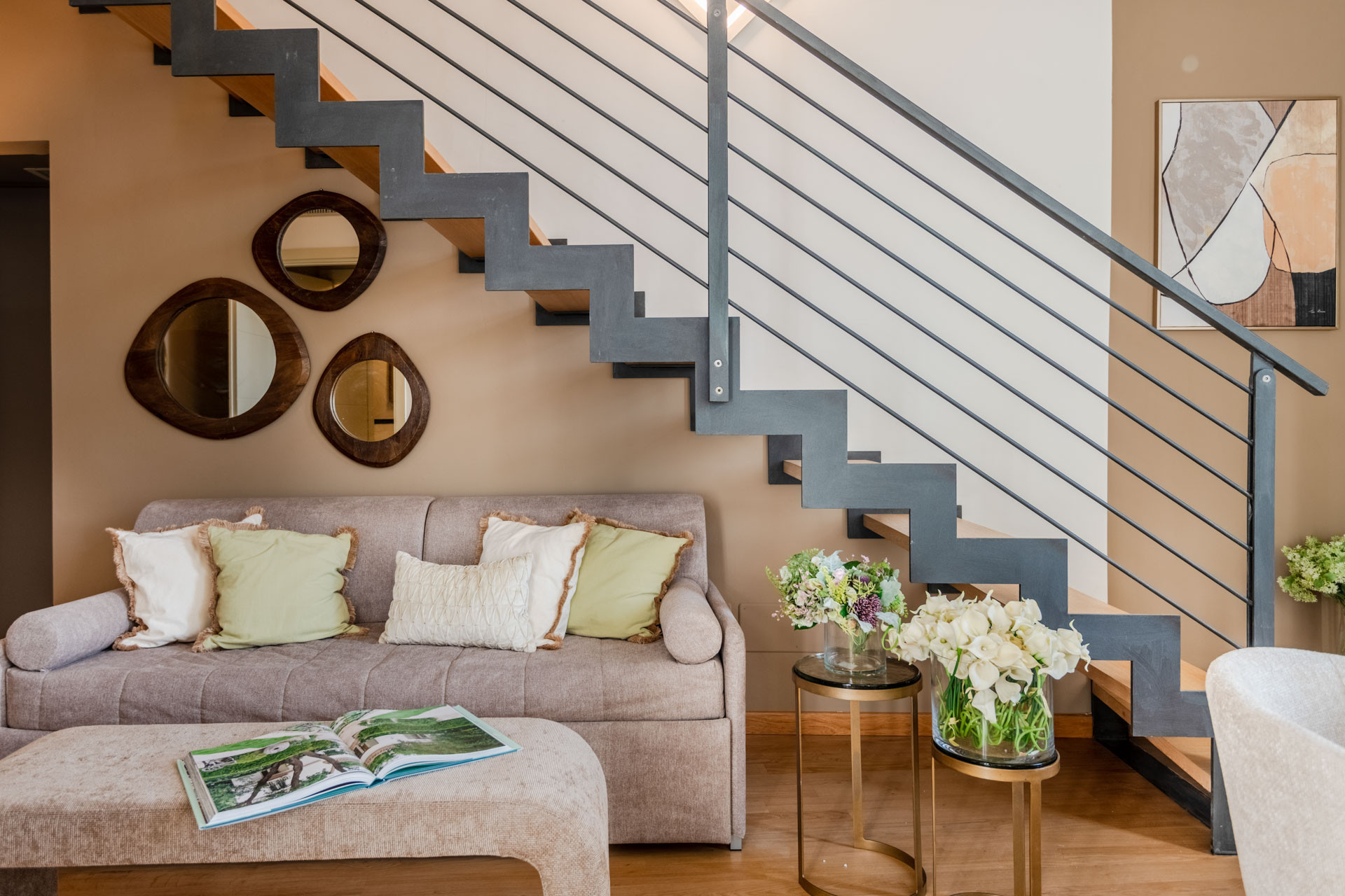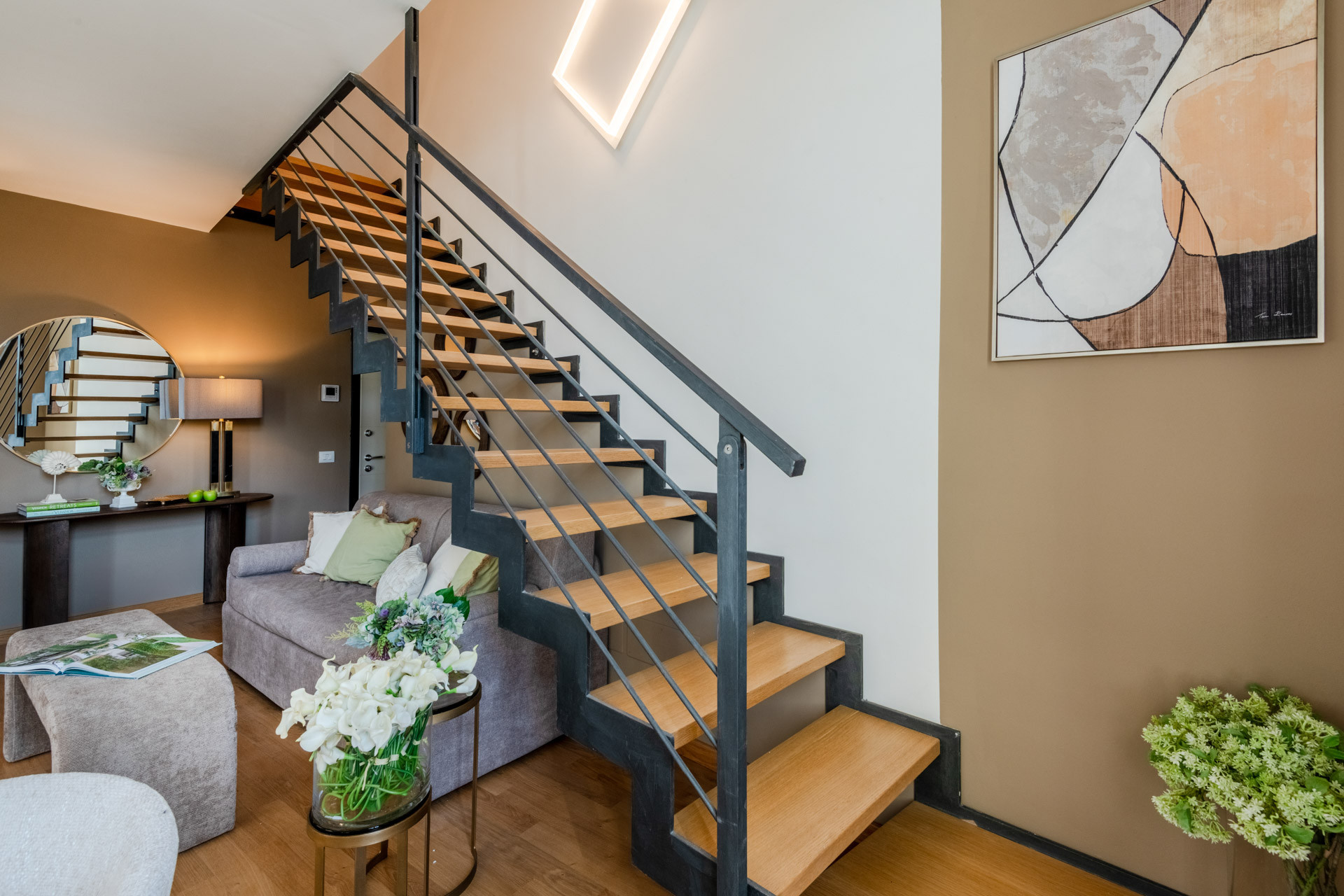 On the third floor, conveniently accessible by elevator, you enter a bright and airy large open-plan living area, featuring an elegant lounge, a fully equipped modern kitchen, and a dining space. This floor also includes a practical guest bathroom. A designer staircase leads to the upper level, which is entirely dedicated to the sleeping area: a romantic master bedroom with its own luxurious ensuite bathroom complete with shower.