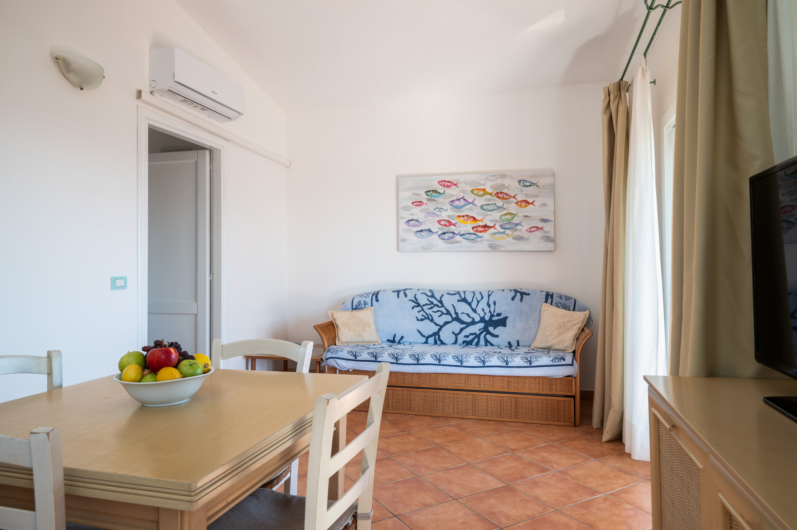 The apartment is designed for comfort and simplicity, making this apartment with sea-view terrace an excellent choice for shortlonger stays. The bright living room features a sofa bed and LED TV, while the fully equipped kitchen includes a fridge, freezer, oven, dishwasher, washing machine and essential cookware. The bedroom is quiet and fitted with air conditioning. The bathroom includes a shower and hairdryer. Wi-Fi is available seasonally from 1 May to 31 October.