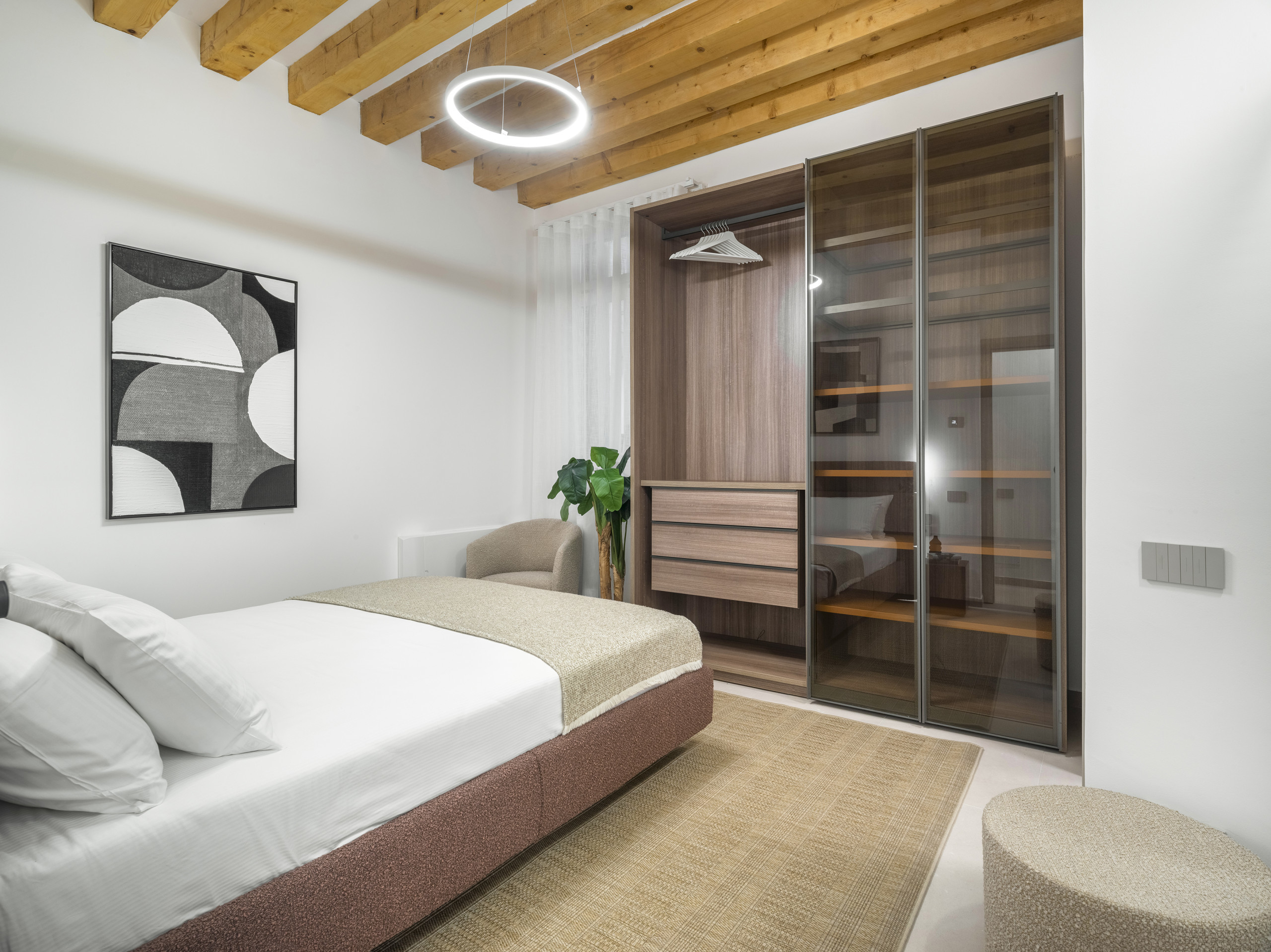 Venetian character and modernity merge to create this small two-room apartment in one of the most tranquil and residential areas of Venice: the Biennale Gardens, in the Castello district.