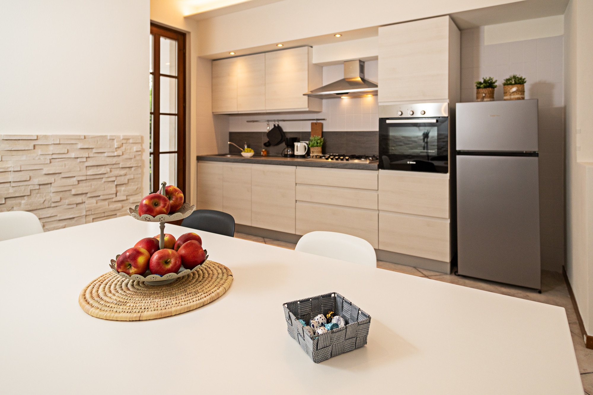 Unten gibt es einen geräumigen Wohn-Ess-Bereich mit Küche und Zugang zur Terrasse. Ebenfalls gibt es unten ein Dusee more