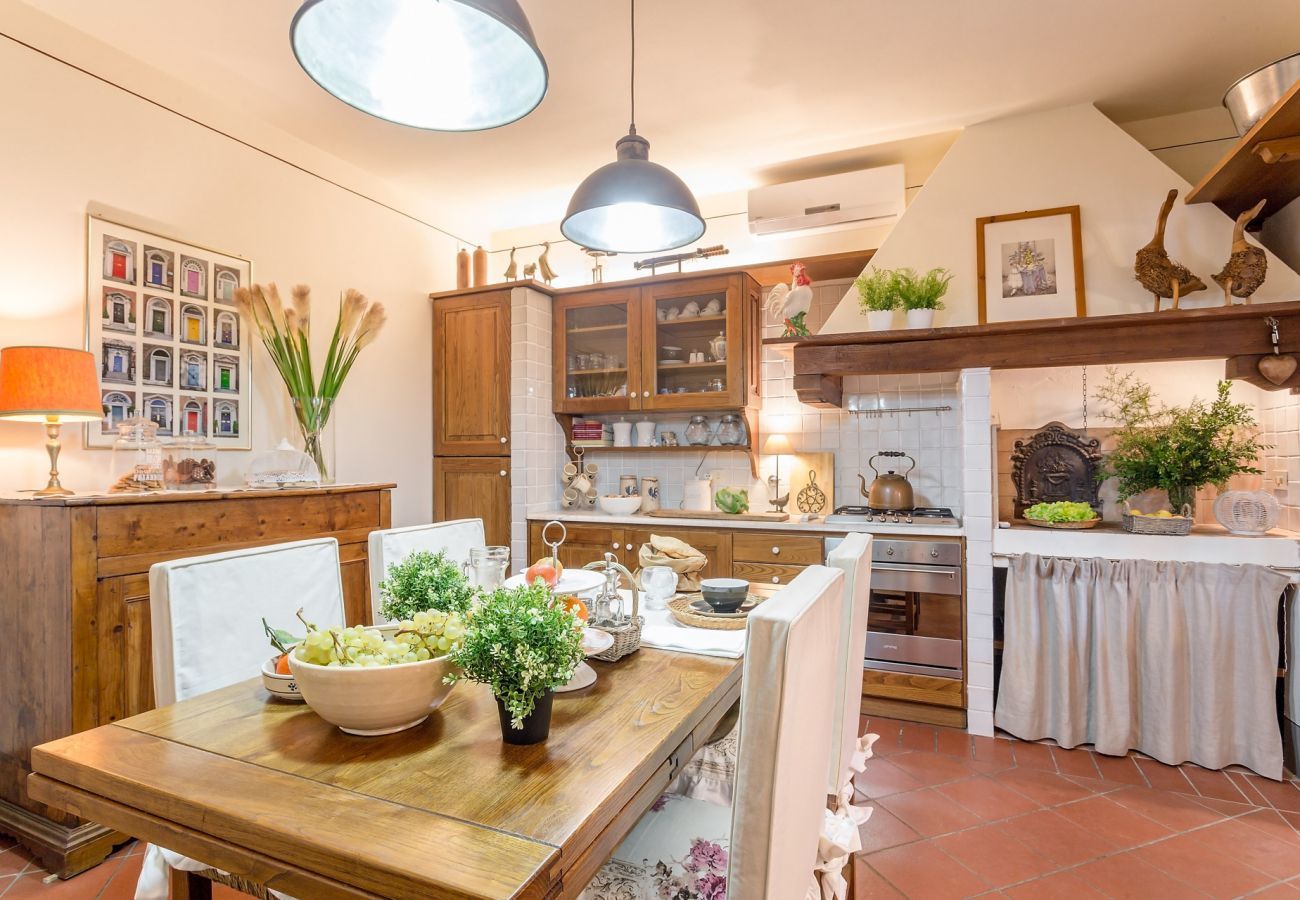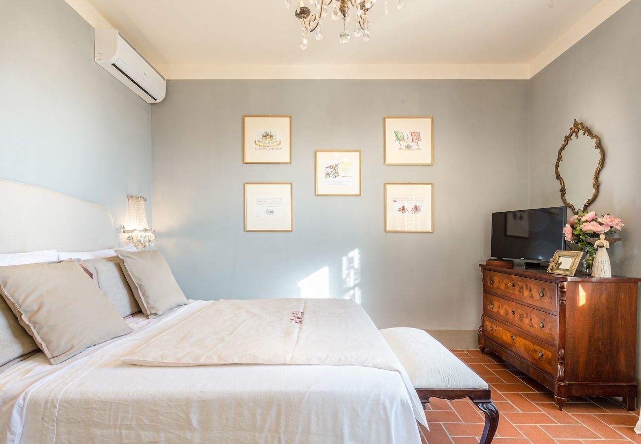 Inside the villa, a masterful restoration harmoniously combines country chic interiors with typical Tuscan flair. The result is an atmosphere as warm as the weather outside. Traditional flagstone floors lead you to the outdoor dining room under an alfresco porch. The fully equipped country-style kitchen opens onto the outside dining area. On cooler evenings you can also opt to dine in the formal dining room which seats up to 12 people. There are also 2 living rooms both with a fireplace and a bathroom. On the first floor there are four bedrooms (three of which with a king size bed and one with two twin beds) and two full bathrooms
