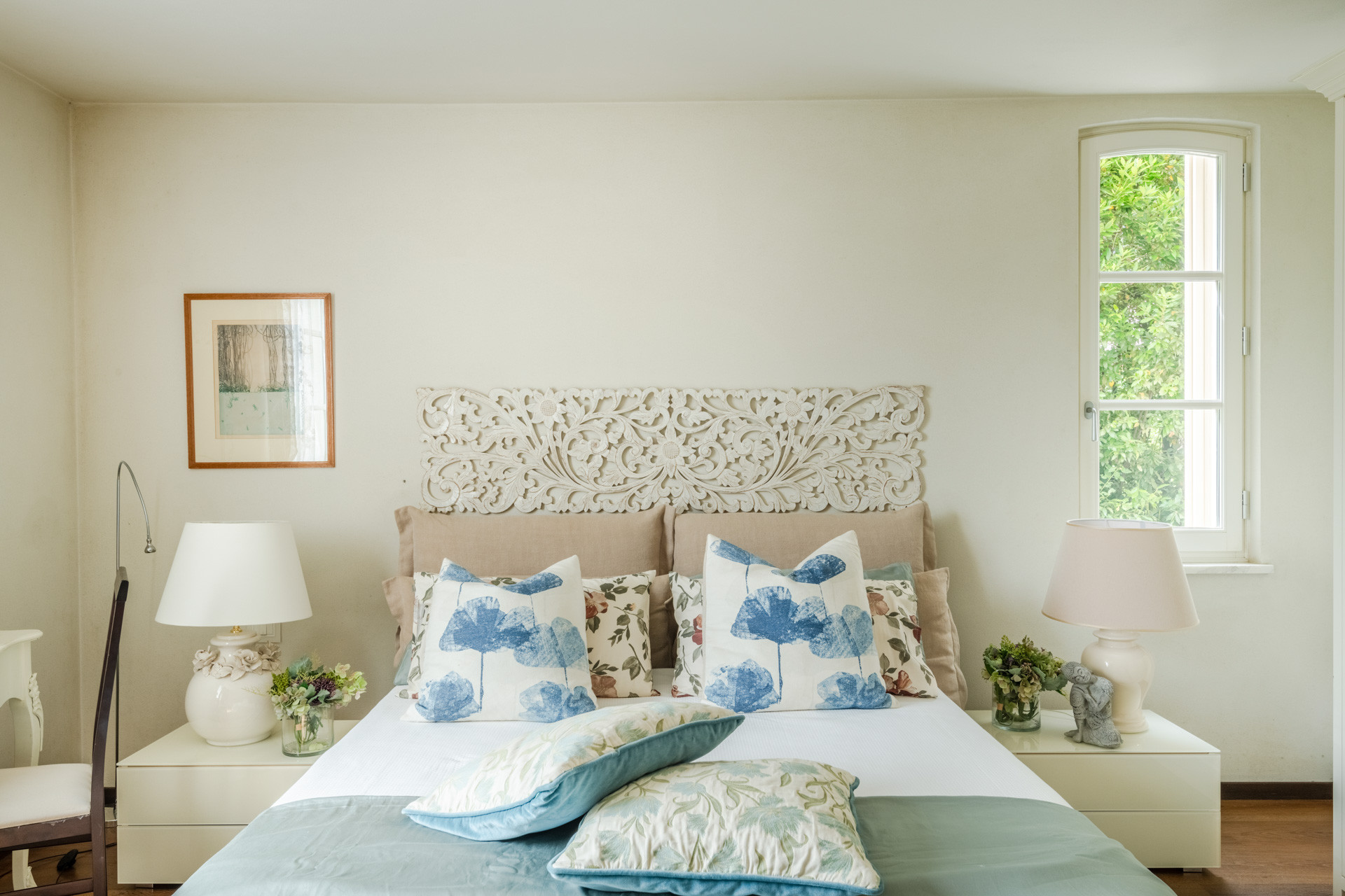 Though you can see the past of VILLA IL CASTELLO in its traditional brick floors, beamed ceilings and fireplaces, the interiors feel bright and airy thanks to updated furniture and crisp light blue and white paint. Let yourself be charmed by the living room’s geometric-patterned rug and elaborately carved sofa table as you sink into the sleek taupe sectional. A long table, eclectic chairs and a contemporary chandelier make the dining room particularly inviting, and the fully equipped kitchen has a central breakfast bar perfect for gathering around.