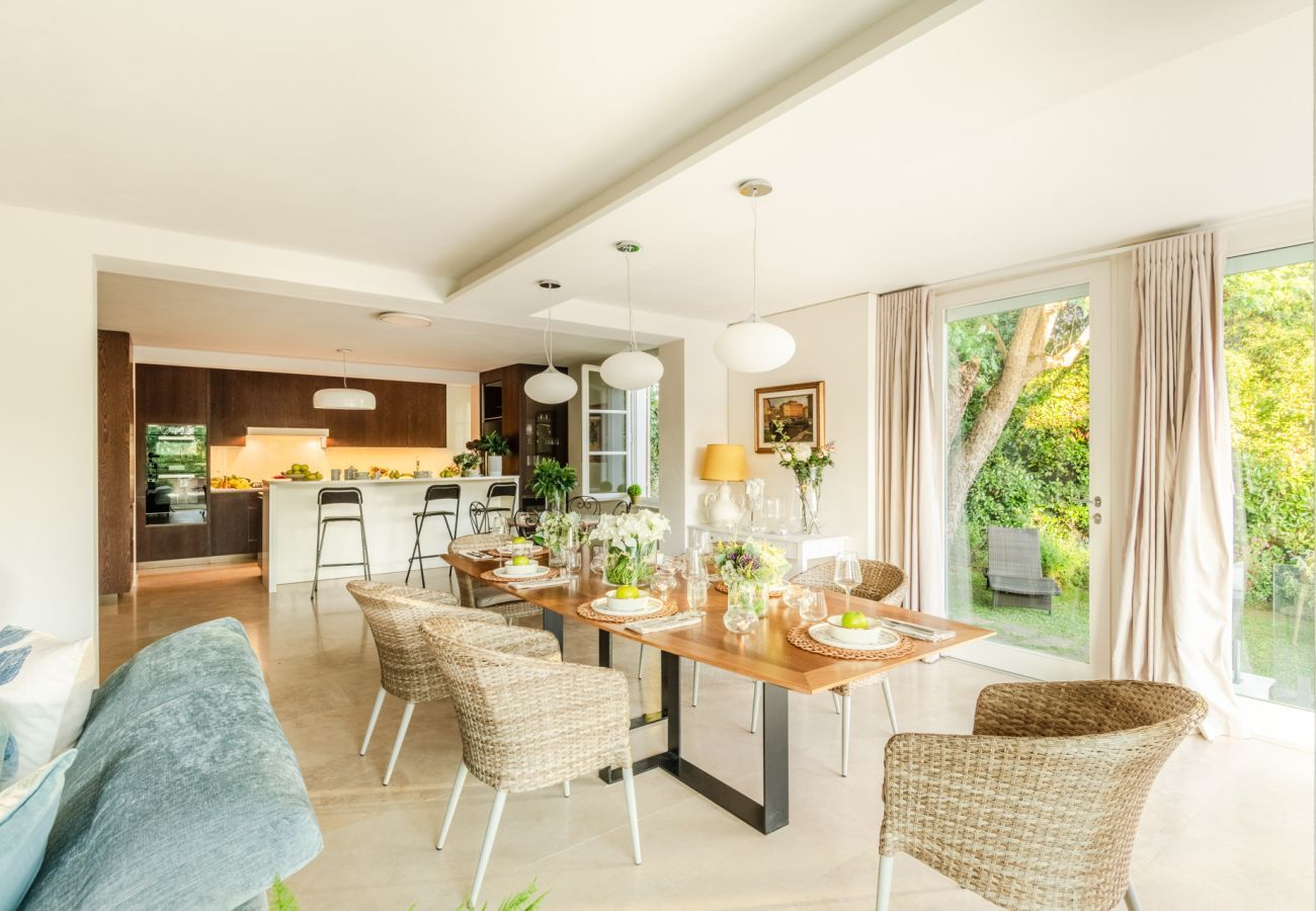 Ground Floor: fully equipped kitchen, dining room, and living room with sliding glass doors opening onto the pool and garden, laundry room, 2 master bedrooms with 2 bathrooms. Please kindly note that while the bedrooms on this floor are not air-conditioned, the house remains cool and pleasant.