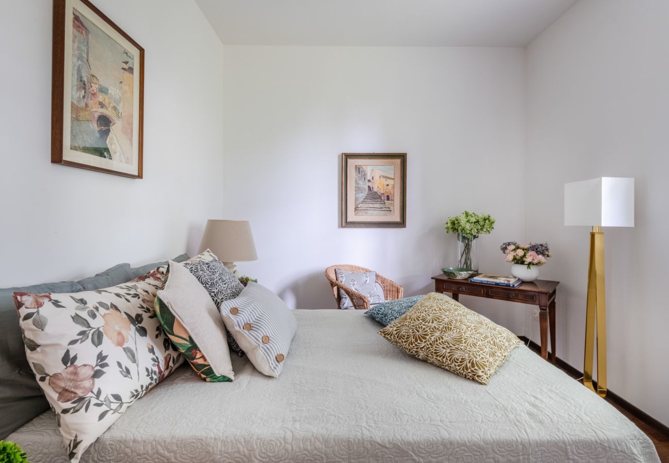 The bedrooms at VILLA IL CASTELLO have the same intriguing combination of soft, traditional earth-toned walls and furnishings with a slightly modern edge.