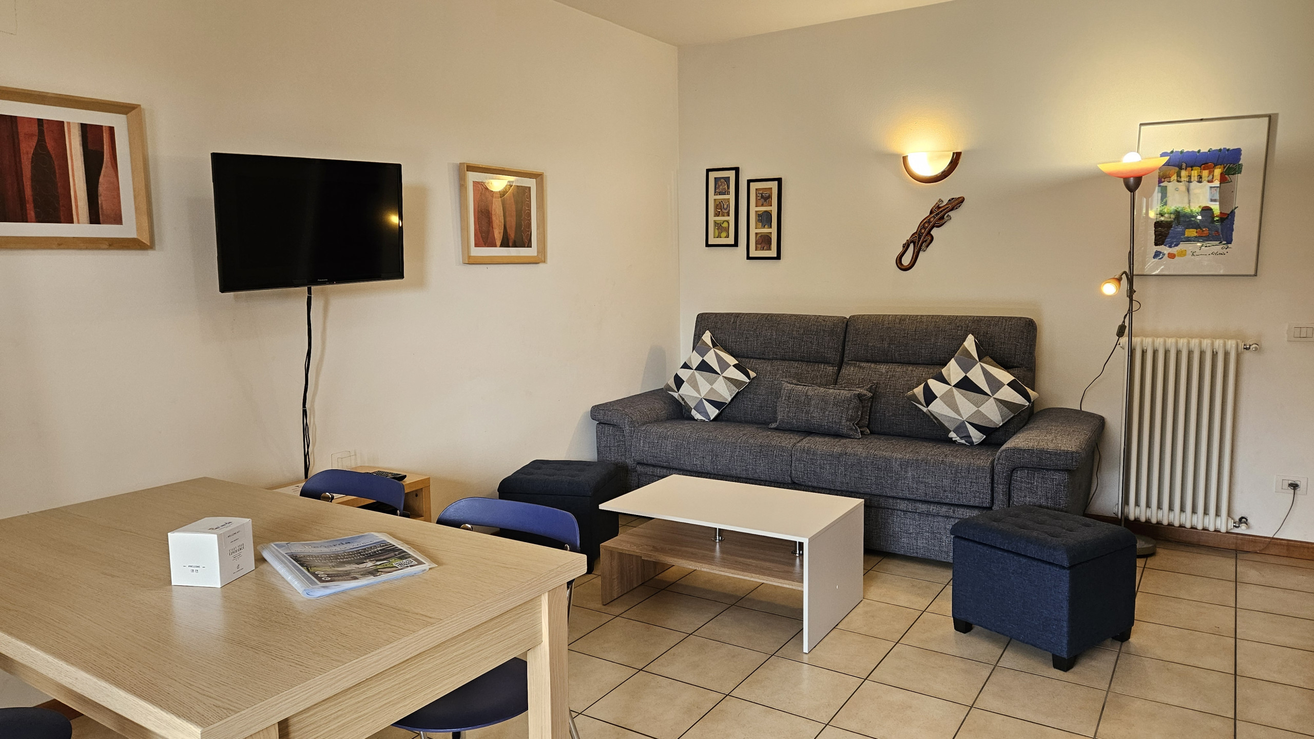 The flat "Costa del Sole" is about 50 sqm and consists of a livingroom with a kitchenette equipped with gas cooker, oven, microwave, fridge with freezer, toaster, electric kettle and coffee machine. The kitchen has a counter and a practical table for 6 persons. A comfortable corner couch can be converted into a sofa bed (2 single beds) for two persons. The living area is equipped with a ceiling fan and satellite TV and overlooks a covered terrace furnished with a table and chairs that is completely screened off by a hedge providing shade and privacy. Spacious double bedroom with wardrobe and access to an outdoor area where it is possible to hang laundry. Air conditioning in the hallway and wifi at guests' disposal. Bathroom with shower box and convenient washing machine. The residence offers 4 non-reserved parking spaces. Pets not allowed. Non-smoking flat.