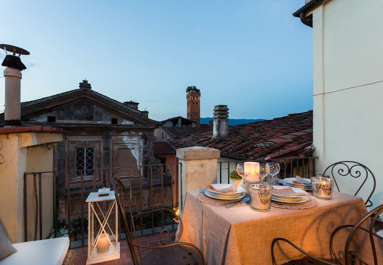 From the living room/kitchen there is access to the terrace with spectacular view over the roofs of Lucca, from where you can enjoy the piano from the nearby music school. The terrace is fully furnished with chairs and table to have breakfast, dining, or simply relax reading a book or with a drink and your loved one while watching the sunset.