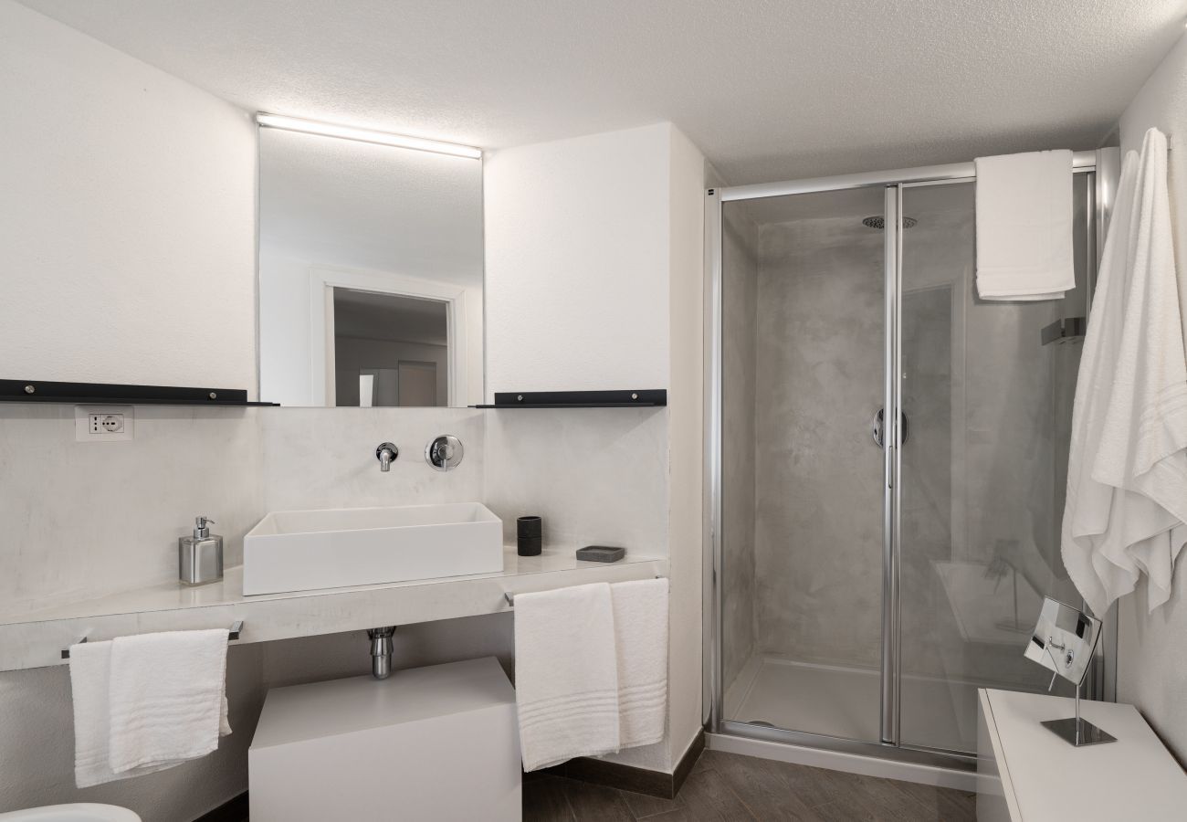 Le point fort de WLofts 12 est sa superbe véranda couverte avec pergola bioclimatique, aménagée avec une table à manger et un éclairage nocturne — parfaite pour se détendre ou manger en plein air. La suite dispose également d’un jardin privé avec pelouse, chaises longues et une pratique douche extérieure. En sortant de la propriété, une petite plage est accessible à pied en environ 100 mètres ; le littoral rocheux typique, tout proche, est idéal pour prendre le soleil. Place de parking privée avec portail électrique incluse.