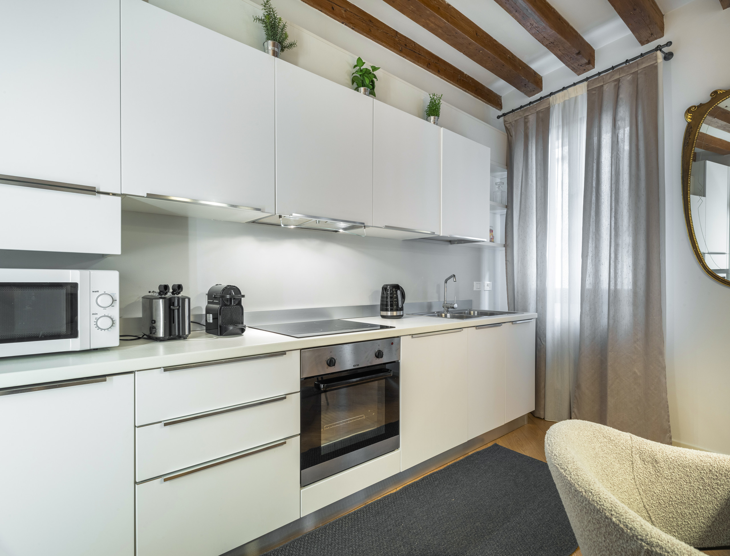 Cet attique, unique en son genre, dispose d'un grand salon ouvert avec cuisine, canapé-lit et table. La chambre est soignée et accueillante, mais le point fort est la terrasse, depuis laquelle on peut admirer une vue spectaculaire des Jardins de la Biennale jusqu'à la Piazza San Marco.