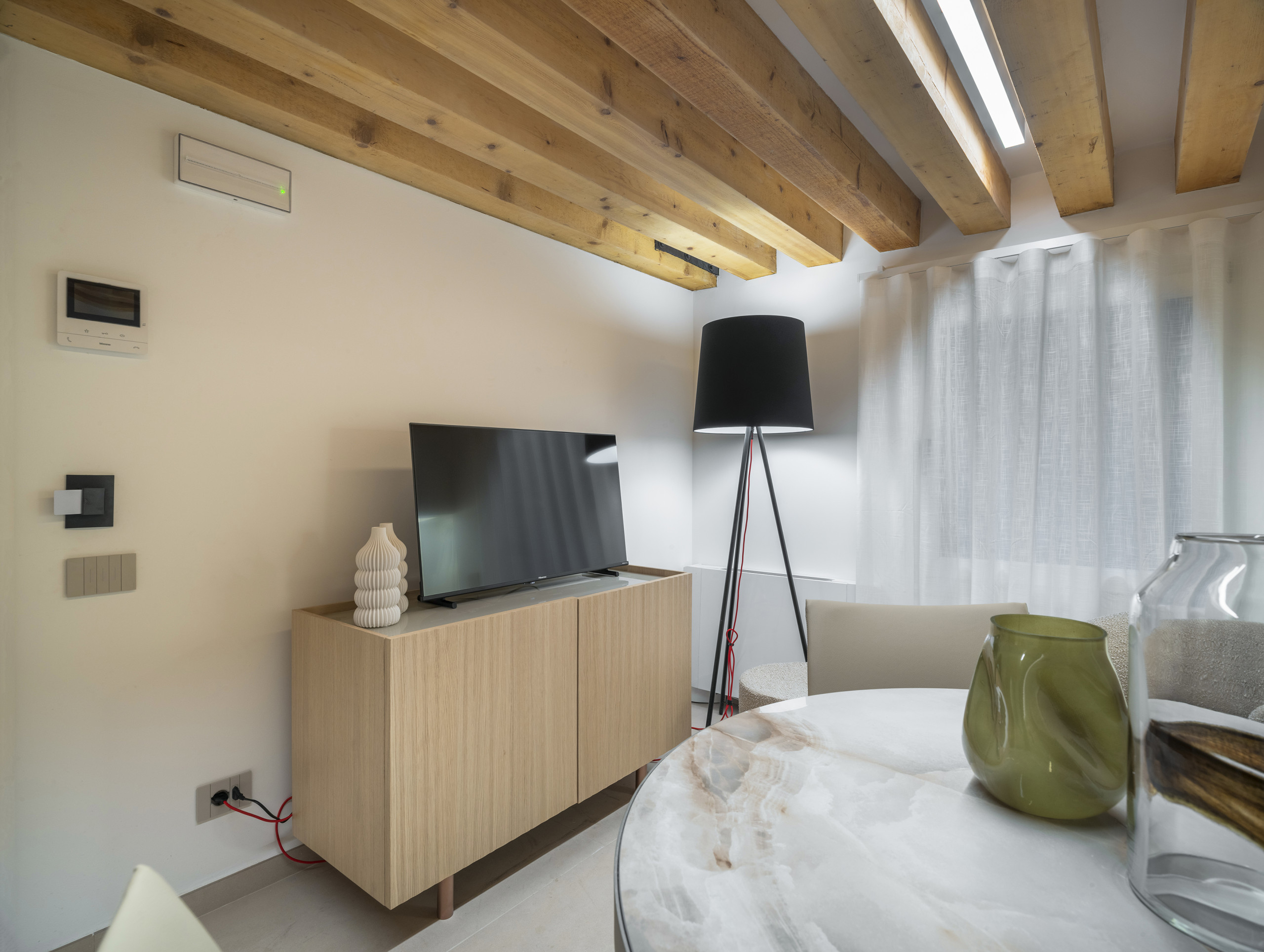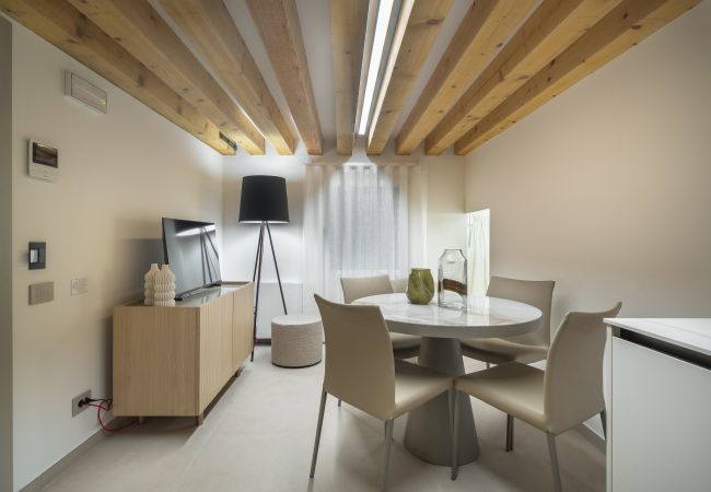 La vénitianité et la modernité se fondent pour créer ce petit appartement deux pièces dans l'un des quartiers les plus calmes et résidentiels de Venise : les Jardins de la Biennale, dans le sestiere de Castello.