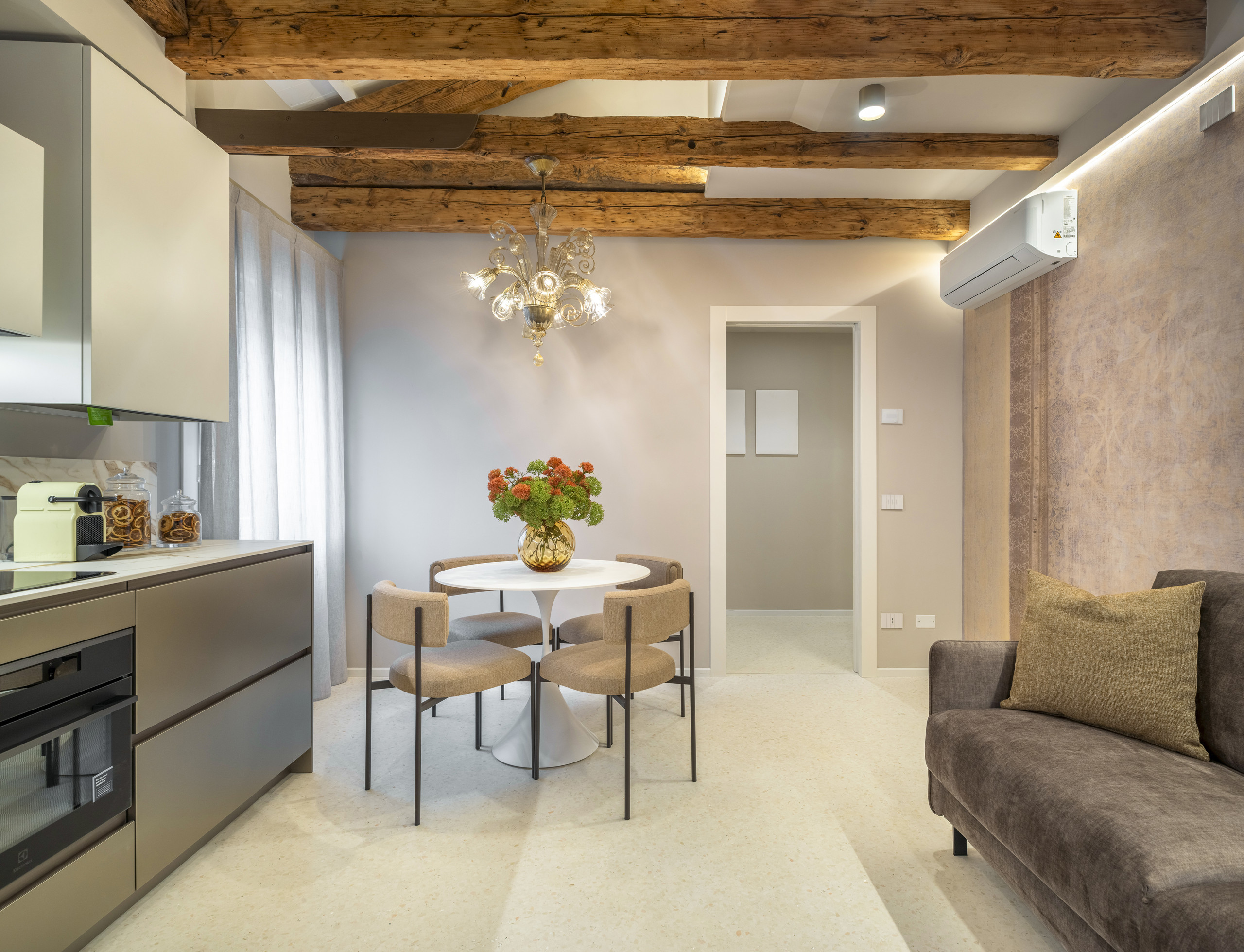 La vénitianité et la modernité se fondent pour créer ce petit appartement deux pièces dans l'un des quartiers les plus calmes et résidentiels de Venise : les Jardins de la Biennale, dans le sestiere de Castello.