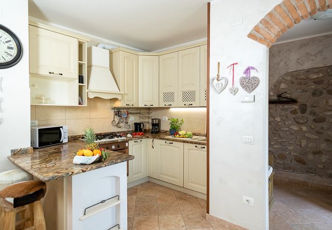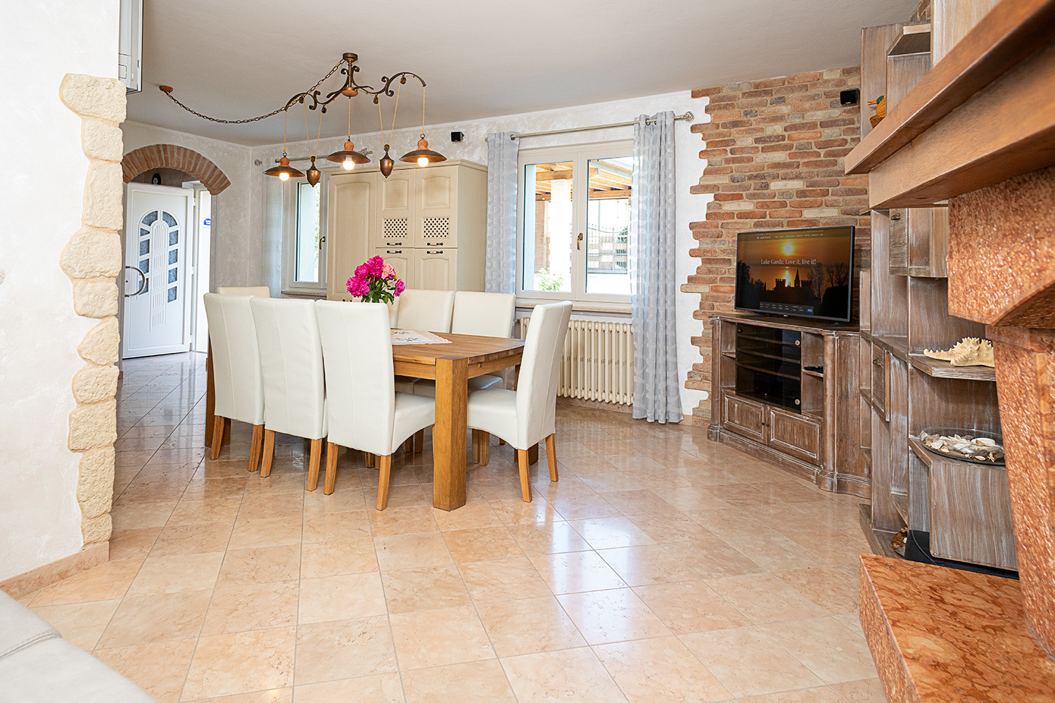 Le Rustico Petra est réparti sur deux étages et comprend un grand salon avec une cheminée décorative (non utilisable), un canapé-lit double, une grande table à manger pour 8 personnes, une télévision satellite et la climatisation. Coin cuisine équipé d'un grand réfrigérateur, d'une cuisinière à gaz à 4 feux, d'un lave-vaisselle et d'un four. Salle de bain avec fenêtre et cabine de douche. Au premier étage se trouvent 3 chambres : une grande chambre matrimoniale avec un grand placard et deux chambres avec un lit simple et un lit escamotable, climatisation, lave-linge, élégante salle de bain avec fenêtre, douche et baignoire balnéo intégrée. Toutes les fenêtres sont équipées de moustiquaires. Des finitions de qualité comme le sol en marbre et les murs en pierre apparente donnent beaucoup de charme à cette habitation. Place de parking extérieure couverte et petit jardin aménagé avec un gazebo, une table et des chaises. Animaux non admis. Appartement pour non-fumeurs. Du lundi au samedi, une navette municipale est disponible pour rejoindre le centre de Bardolino.