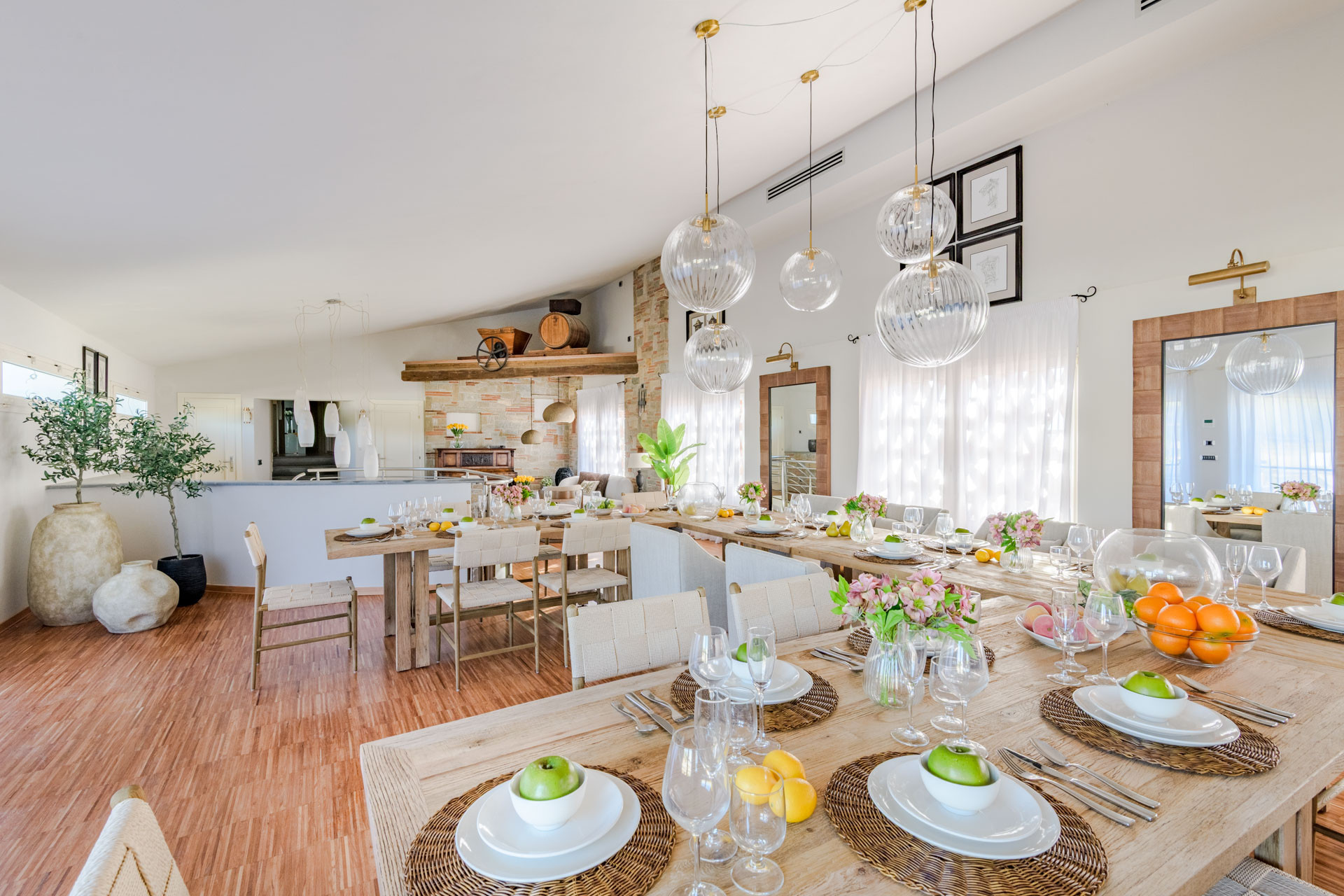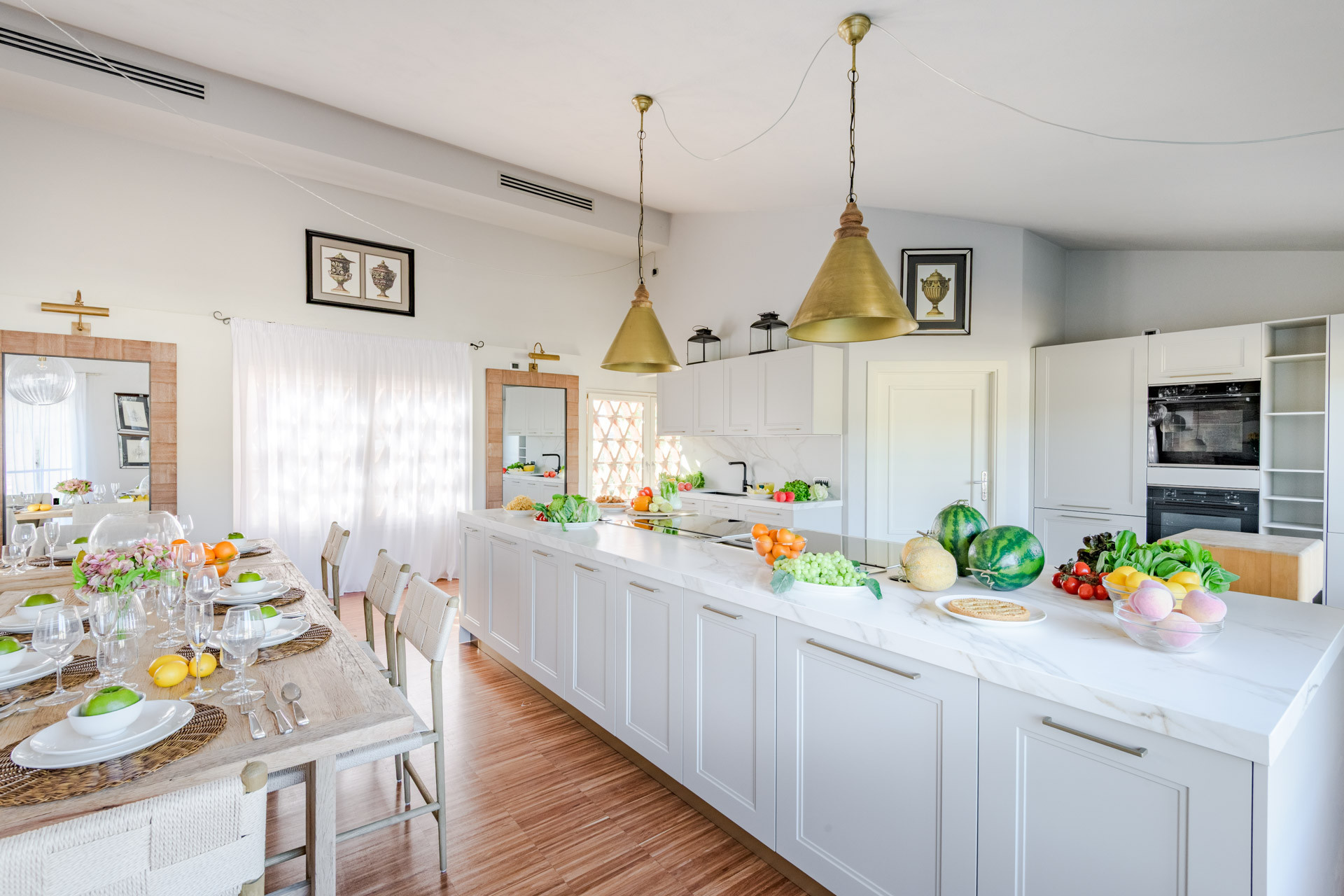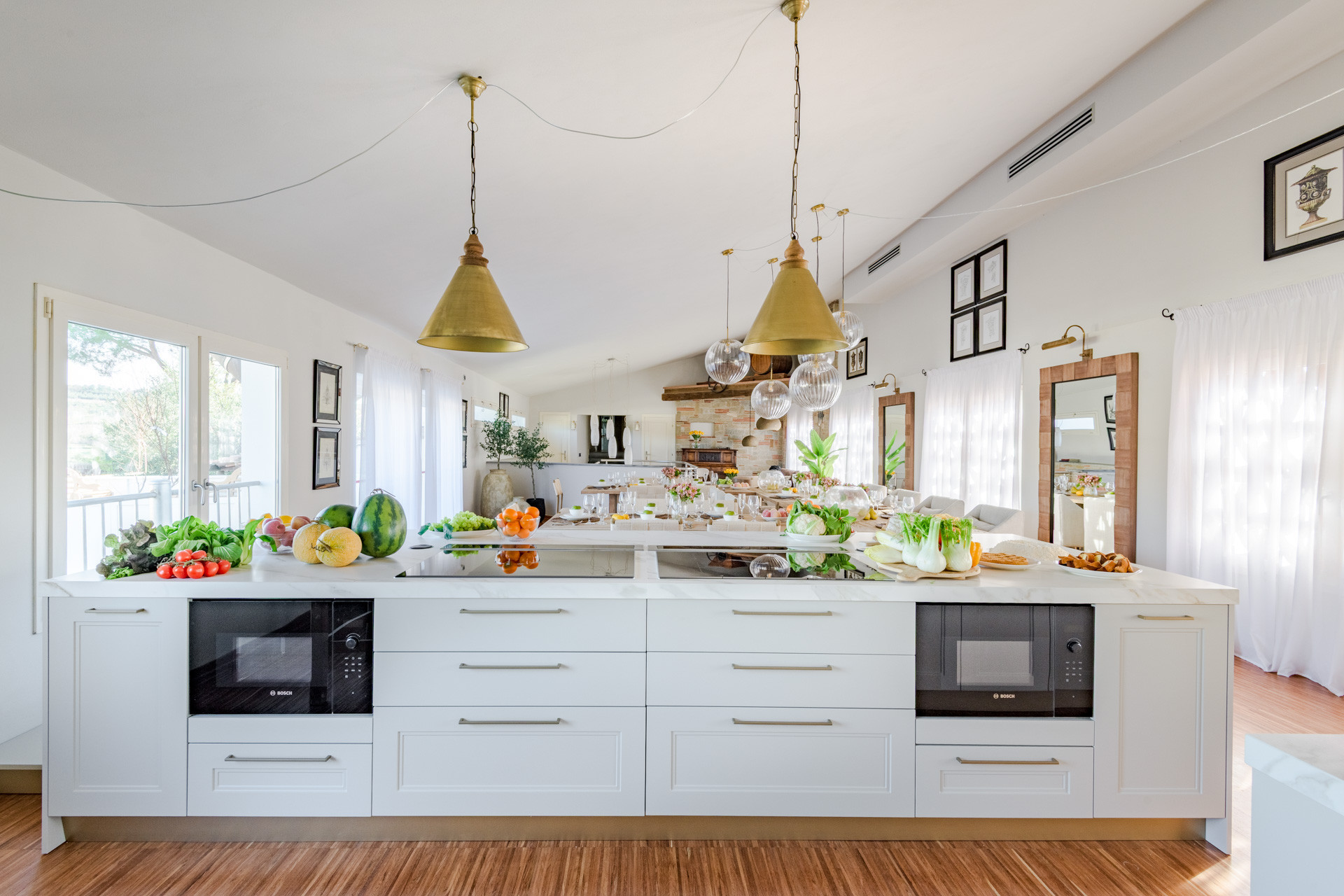 La cuisine américaine, à induction, est équipée avec réfrigérateur, micro-ondes, four, congelateur, lave-vaisselle, vaisselle/couvert, ustensiles/cuisine et cafetière.