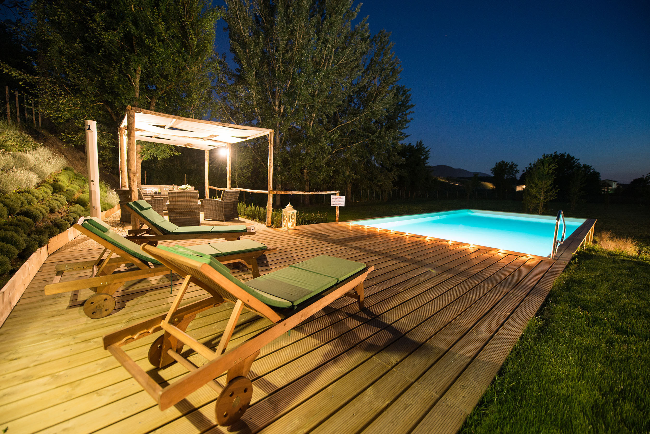 The farmhouse has a wonderful swimming pool with an amazing view across the garden and a solarium area. The swimming pool, 10 x 5 meter, is located in front of the house and is surrounded by a relaxing area equipped with a gazebo. Absolutely suitable for romantic nights.